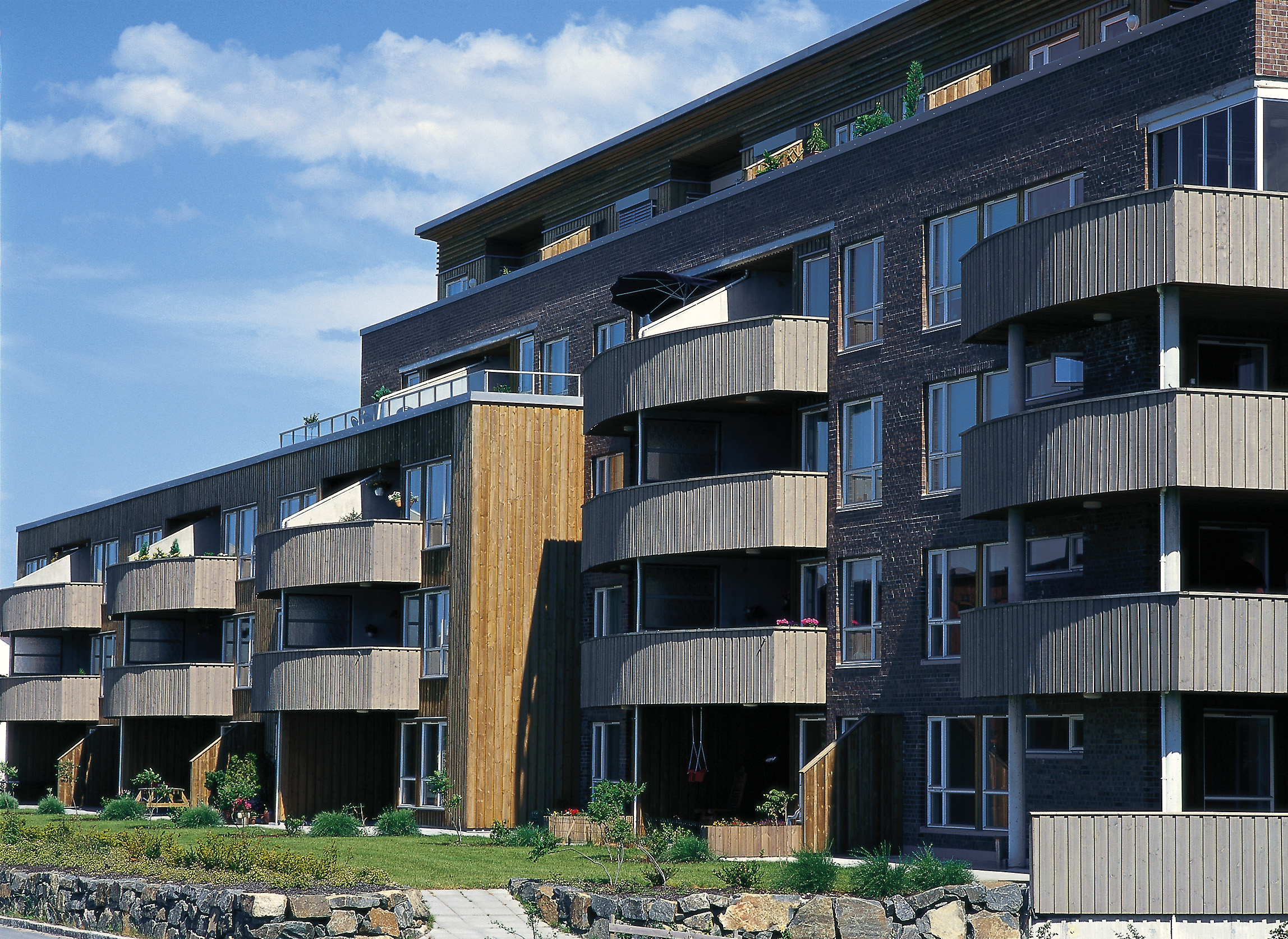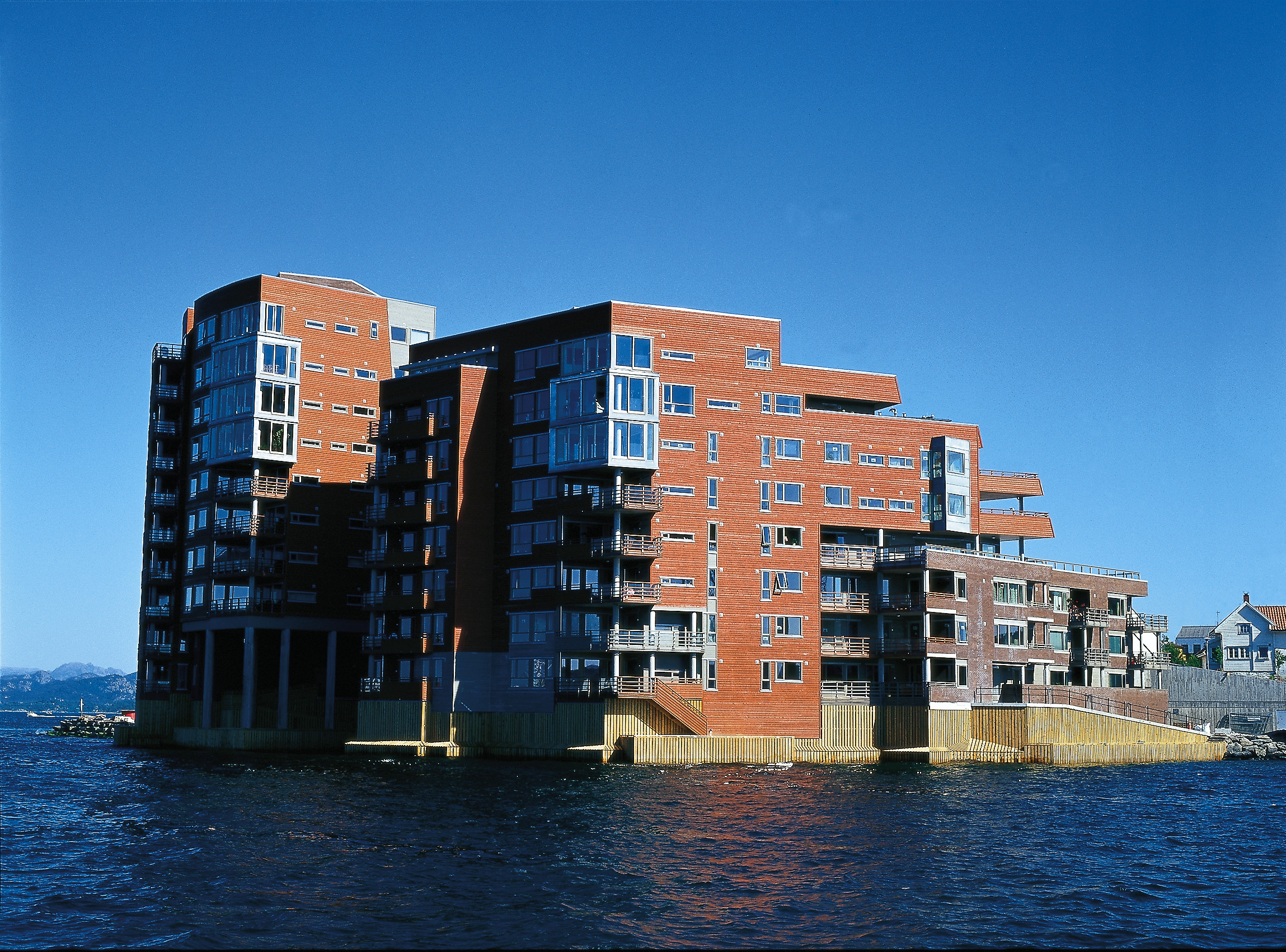 Utviklingen fra de tradisjonelle trebygninger har gått en lang vei. Her er konstruksjonen i betong og stål, hvorpå bygget er kledd utvendig. Det er lagt inn det som på fagspråket heter boligsprinkling, blant annet for å imøtekomme nettopp brannkrav. I de lavere partier på Stavanger Brygge er bruk av tre kombinert med tegl og betong med innslag av glassbyggersten.