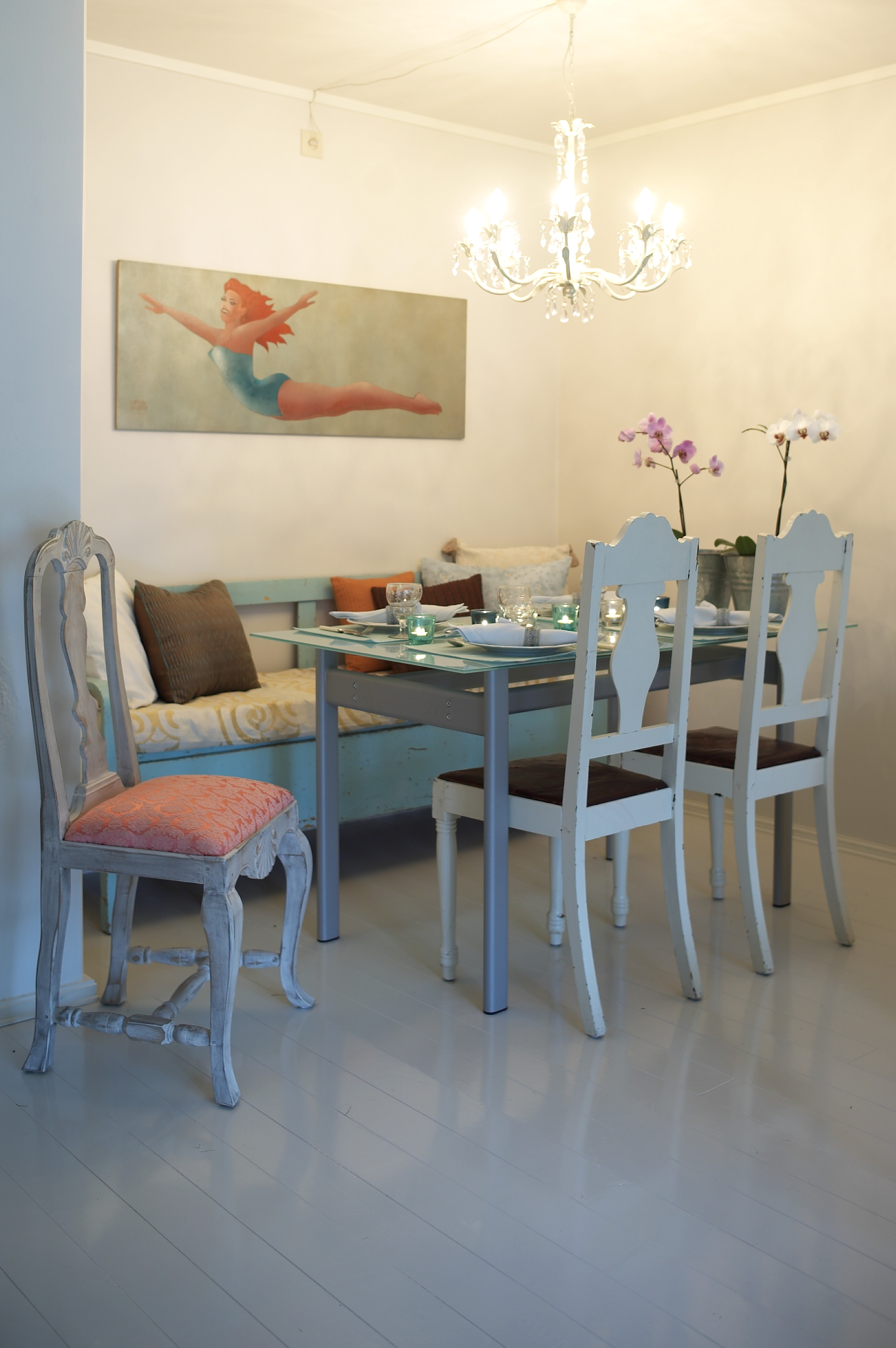 Eieren ønsket ny stil og nye farger. Noe som var helt annerledes enn denne furuleiligheten med mørke, mettede farger og også helt annerledes enn boligen med minimalistisk stil som hun flyttet ut av. Nå ville hun omgi seg med ting hun var glad i, litt brukt og litt nytt, litt flott og litt slitt - kort sagt shabby-chict!