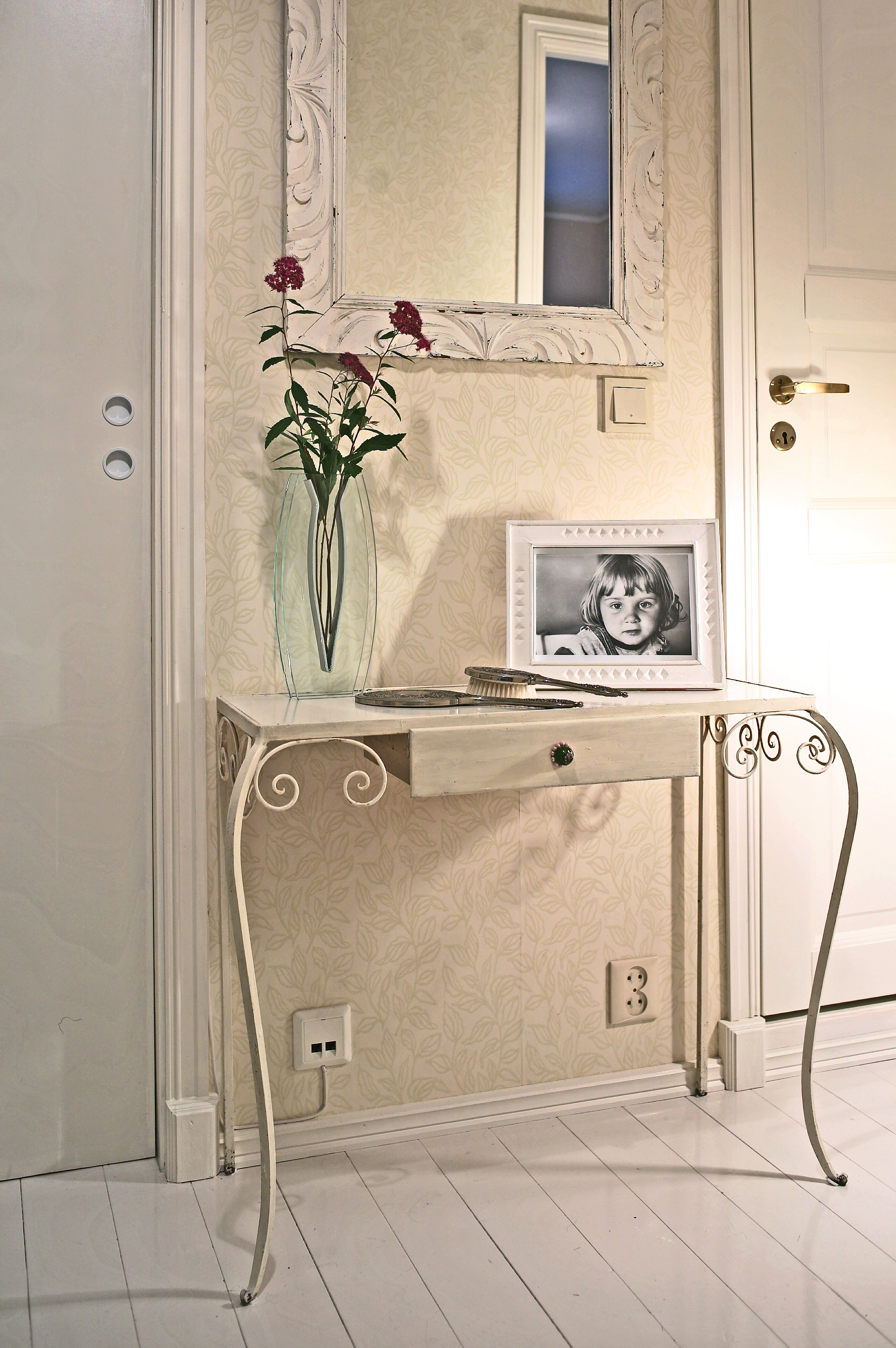 Resultatet av oppussingen ble en personlig leilighet som har "vokst" med lyse farger. Lette møbler gjør at den også er funksjonell, eieren trengte et lite hjemmekontor og det fikk hun med et skatoll i entreen! Et gammelt sminkebord med ny farge ble et fint avlastningsbord til å legge fra seg hansker og post på i gangen, og man har satset på små, lette møbler.