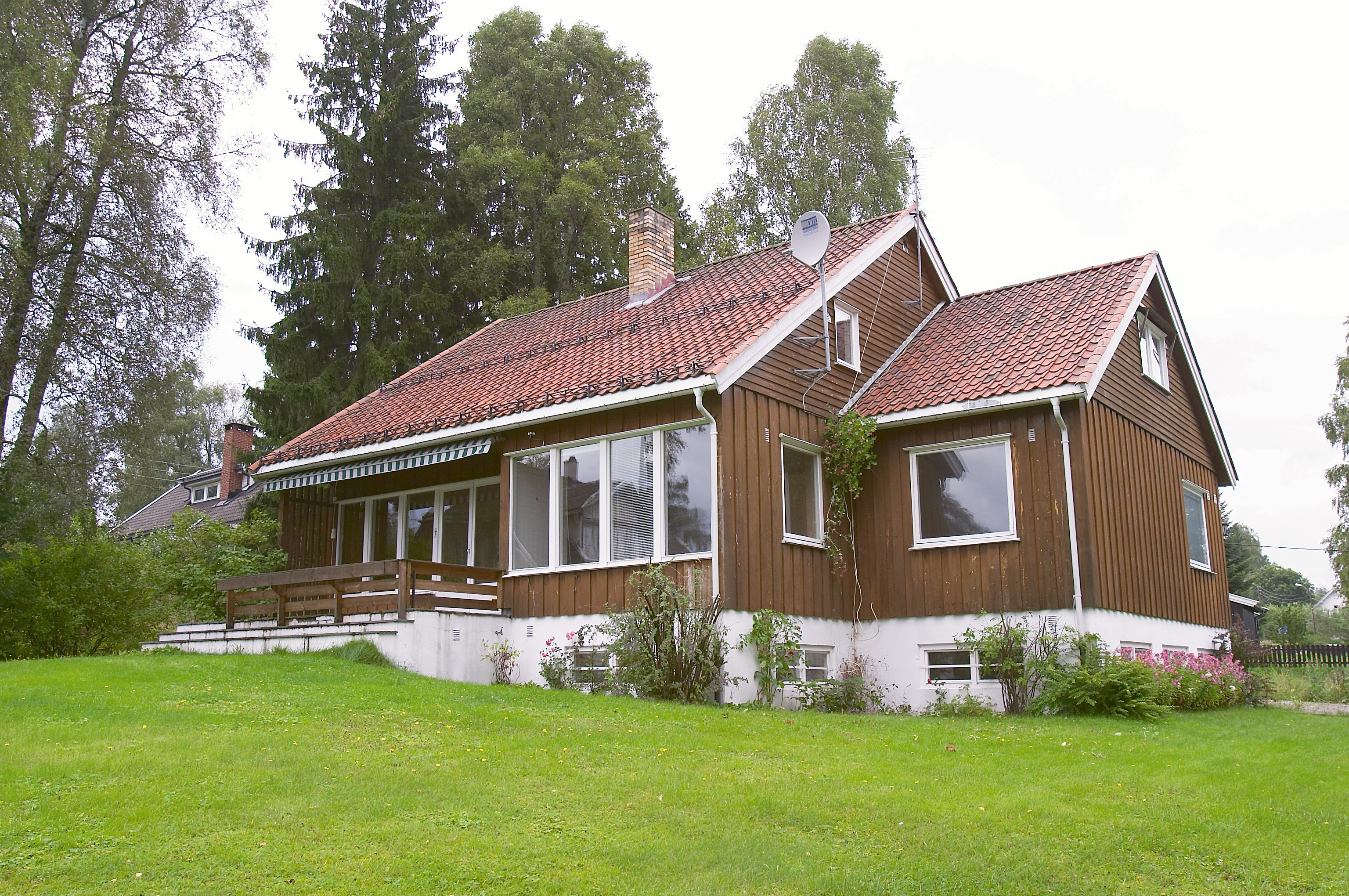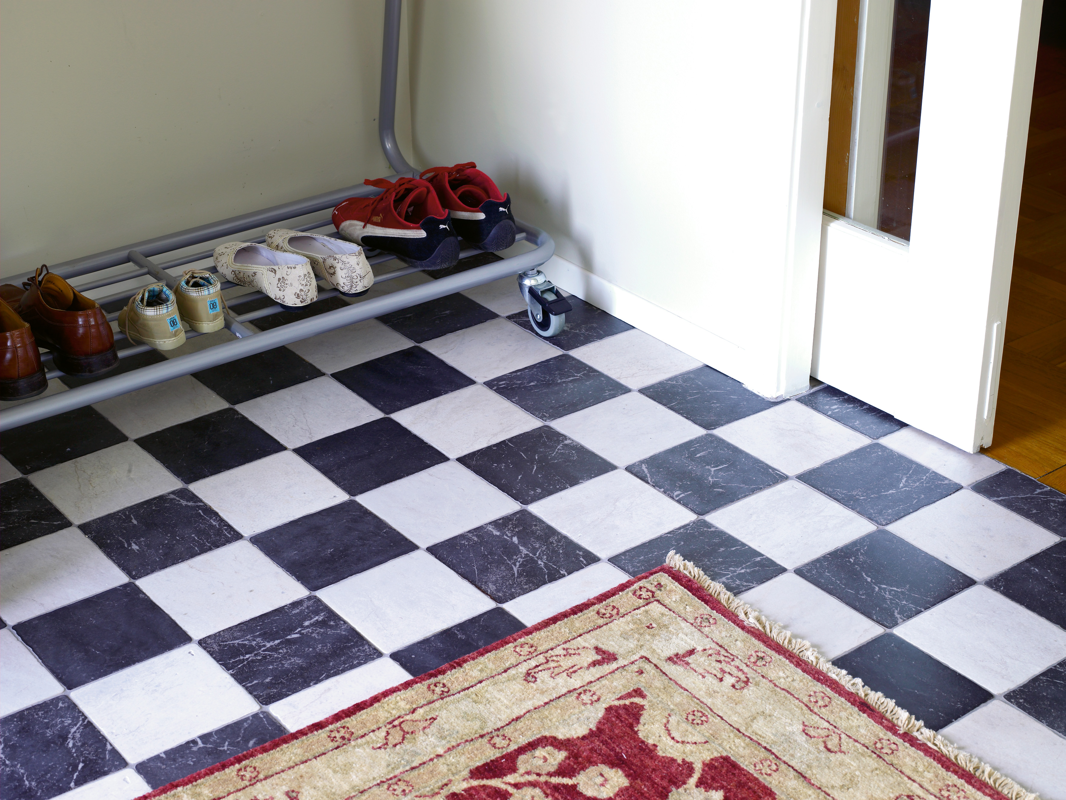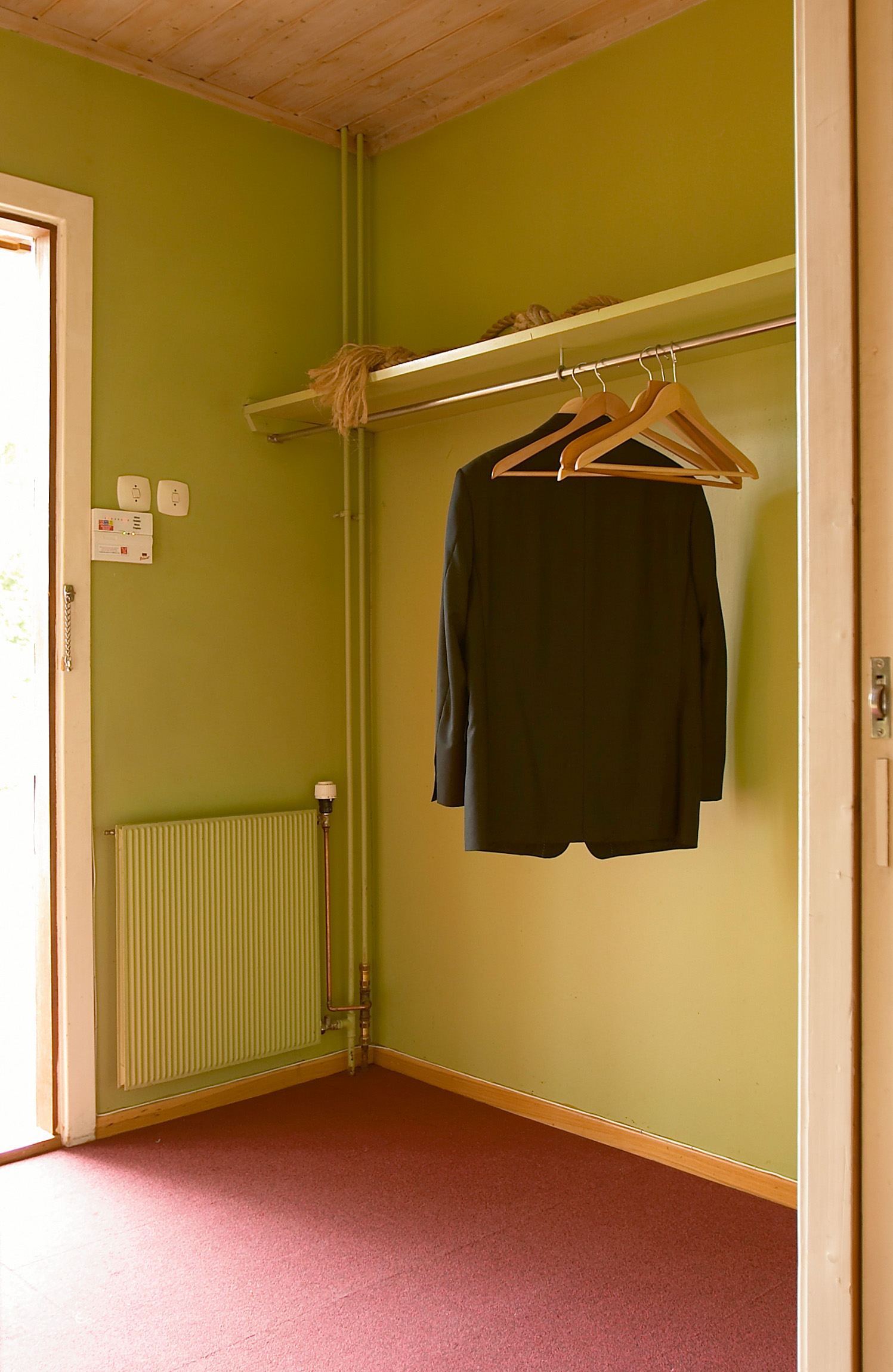 - I hallen var trappetrinnene belagt med grønn linoleum. Denne ble malt i en blank gråfarge. Furuveggene ble malt lyse, og som dekorasjon ble det malt noen mørkere striper på dem.