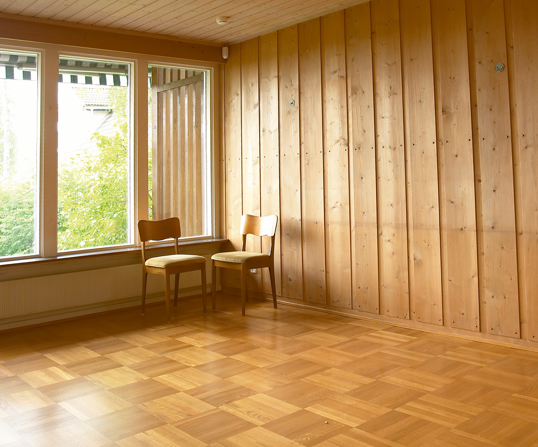 - Parkettgulvene ble beholdt som de var. Disse vakre gulvene kom til sin rett da de fikk være eneste varme fargeinnslag.