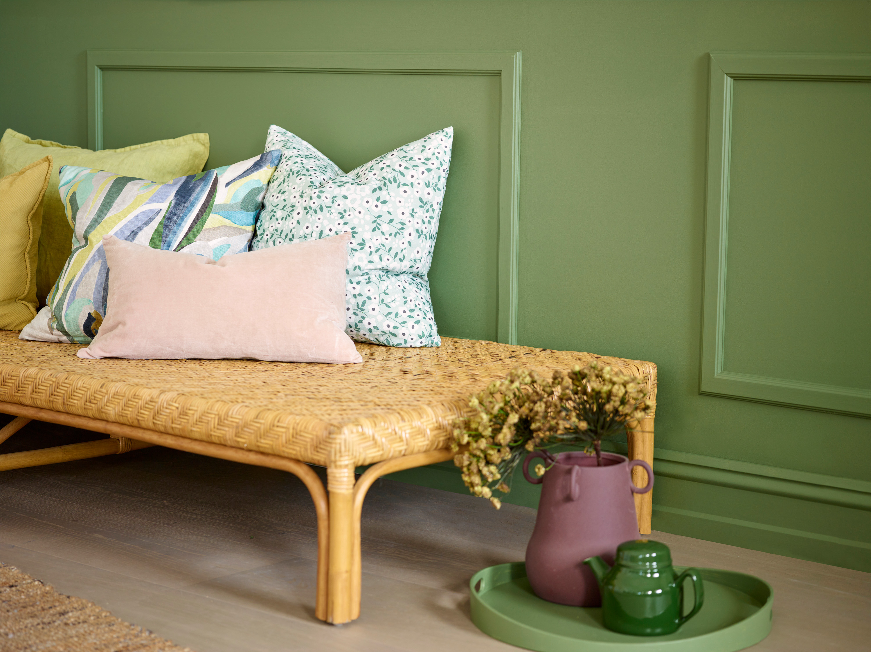 Friske blomster, grønne planter, lysestaker og keramikk i de samme fargene binder helheten sammen. Bytt noen få ting på hyller og bord i stedet for å kjøpe alt nytt – det handler mest om fargesammensetningen, ikke mengden ting. I gangen kan en malt innerdør, en fargerik knaggerekke eller en ny løper møte deg med vårfølelse hver gang du kommer hjem.