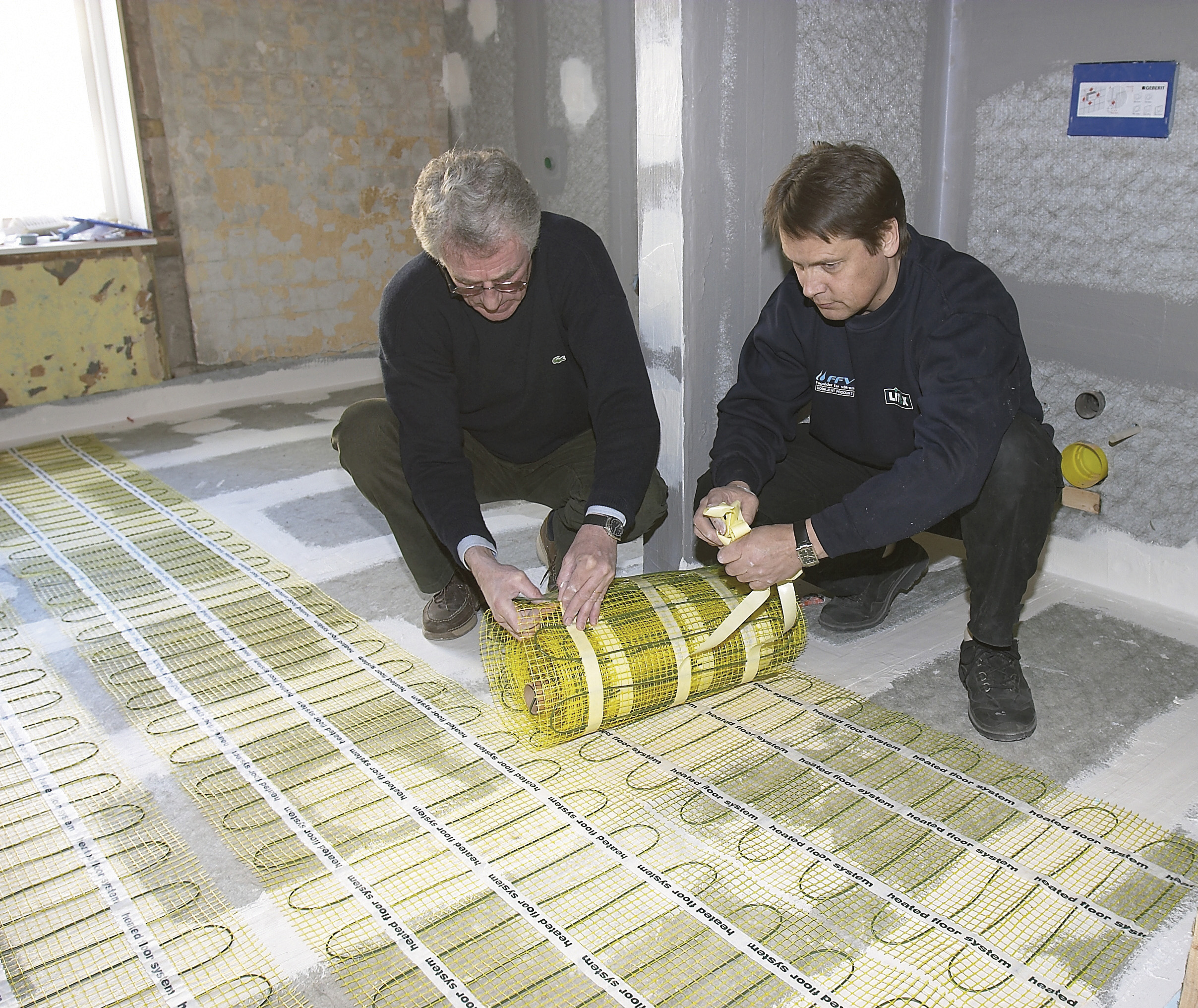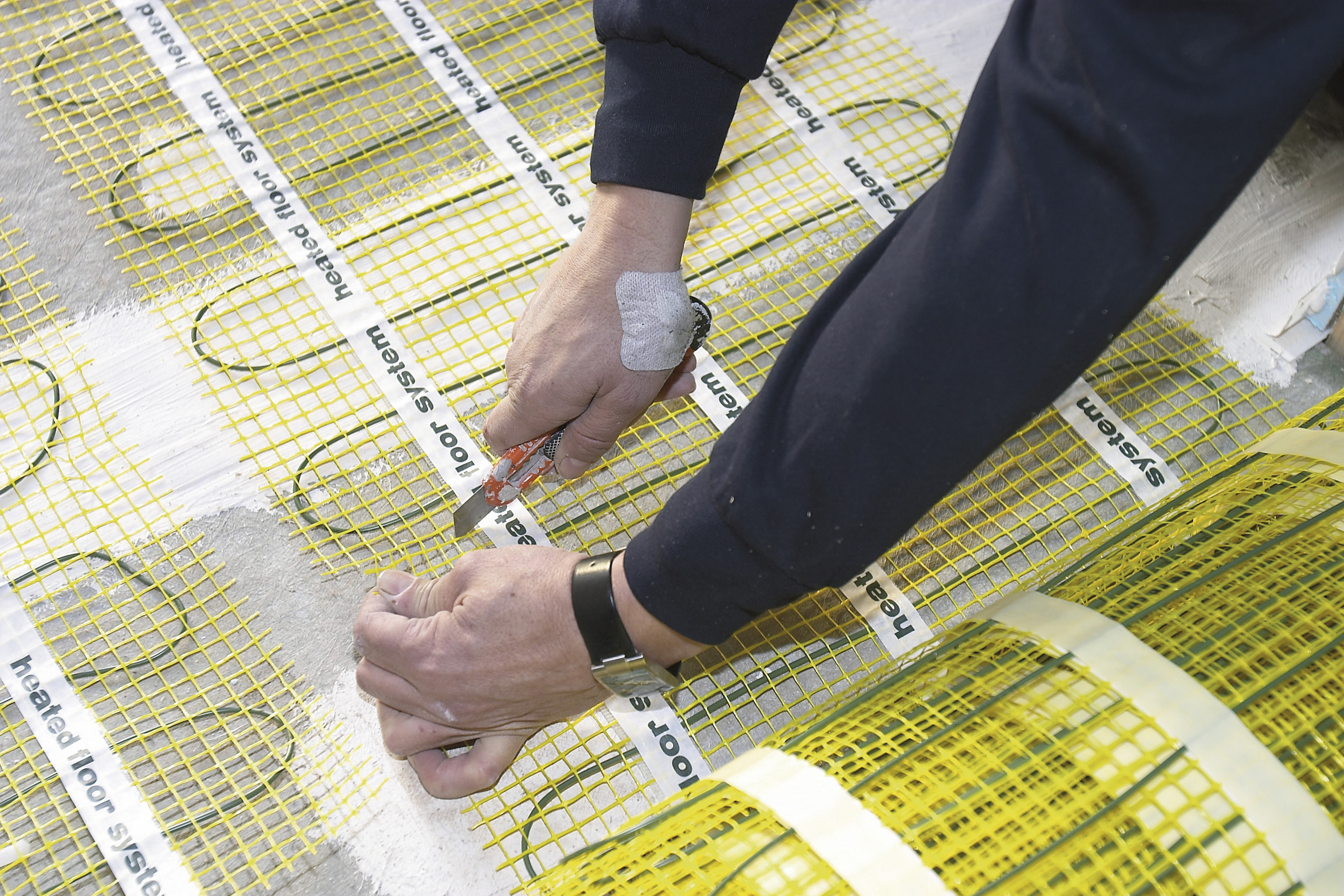 Varmen i gulvet kommer fra tynne kabler som er bundet sammen i et nett.