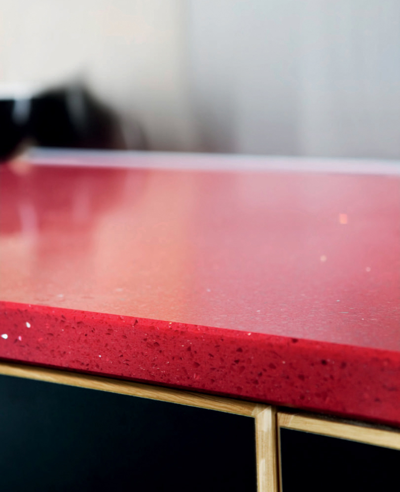 Corian er et kunstig materiale. Det er svært slitesterkt, vedlikeholdsfritt og tåler mye søl og varme. Fordi materialet er gjennomfarget kan flaten pusses ned om det skulle få skader.