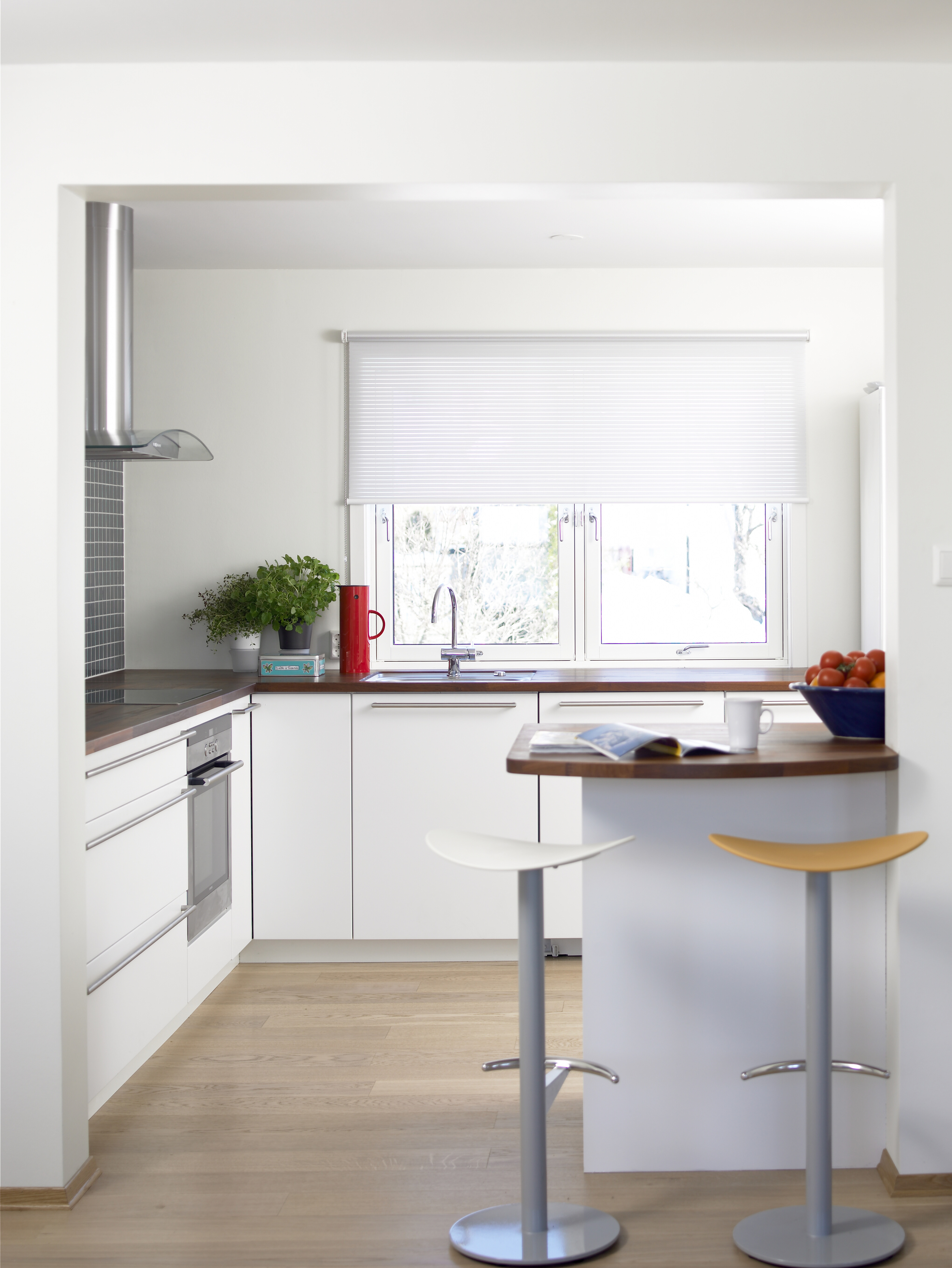 Løsningen var å fjerne store deler av veggen inn mot stuen: Et grep som fikk det fordums trange rommet til å føles mye større. Men dermed fjernet en også hele veggen der vask og røropplegg lå før. Hele planløsningen måtte følgelig snus om på: Hele vindusveggen har nå fått lav, fast innredning. Her ligger også den nye våtsonen. - Når en først er nødt til å vaske opp en gang iblant, er det mye hyggeligere å se ut enn å glane i veggen, mener beboerne.
