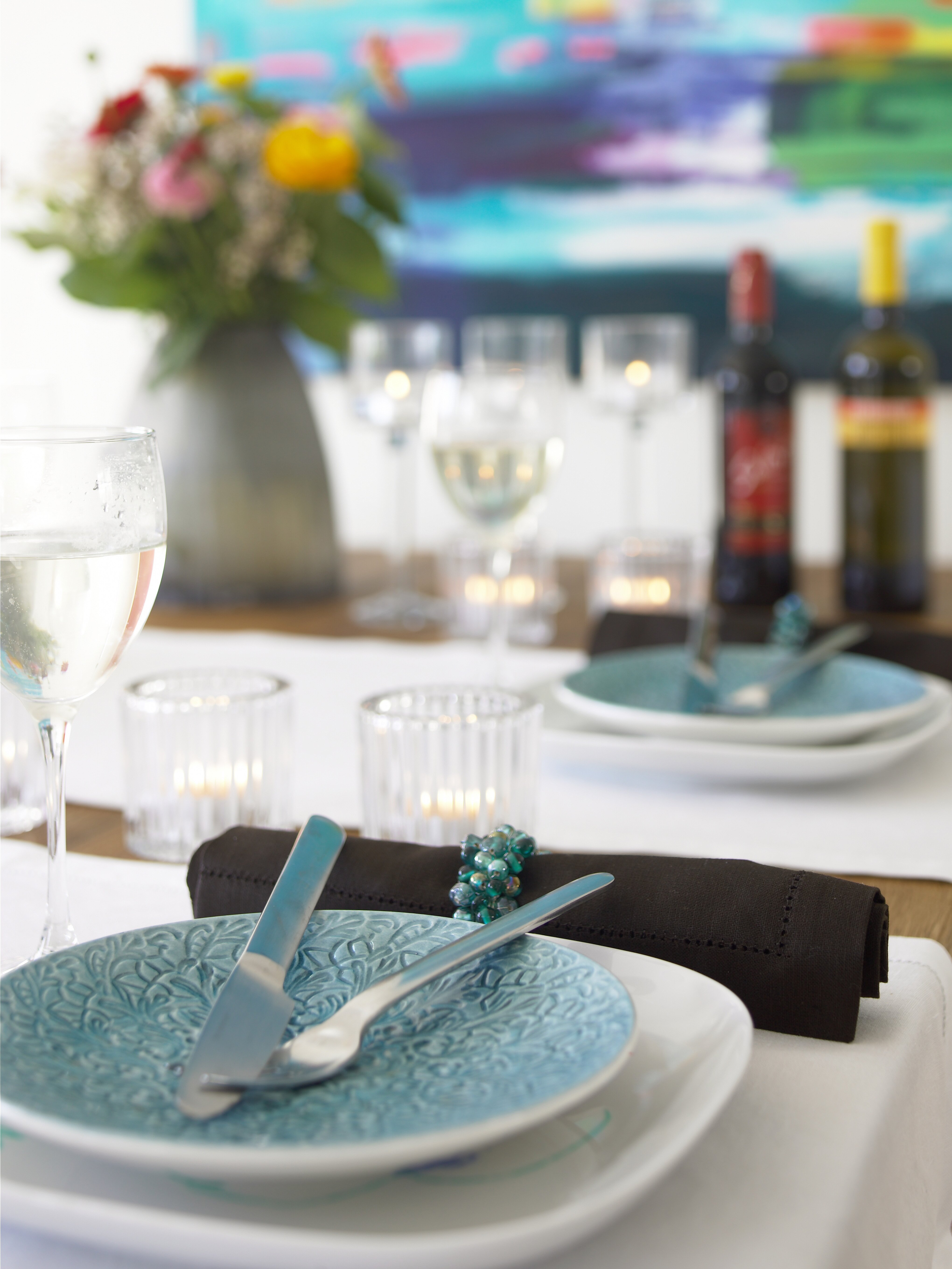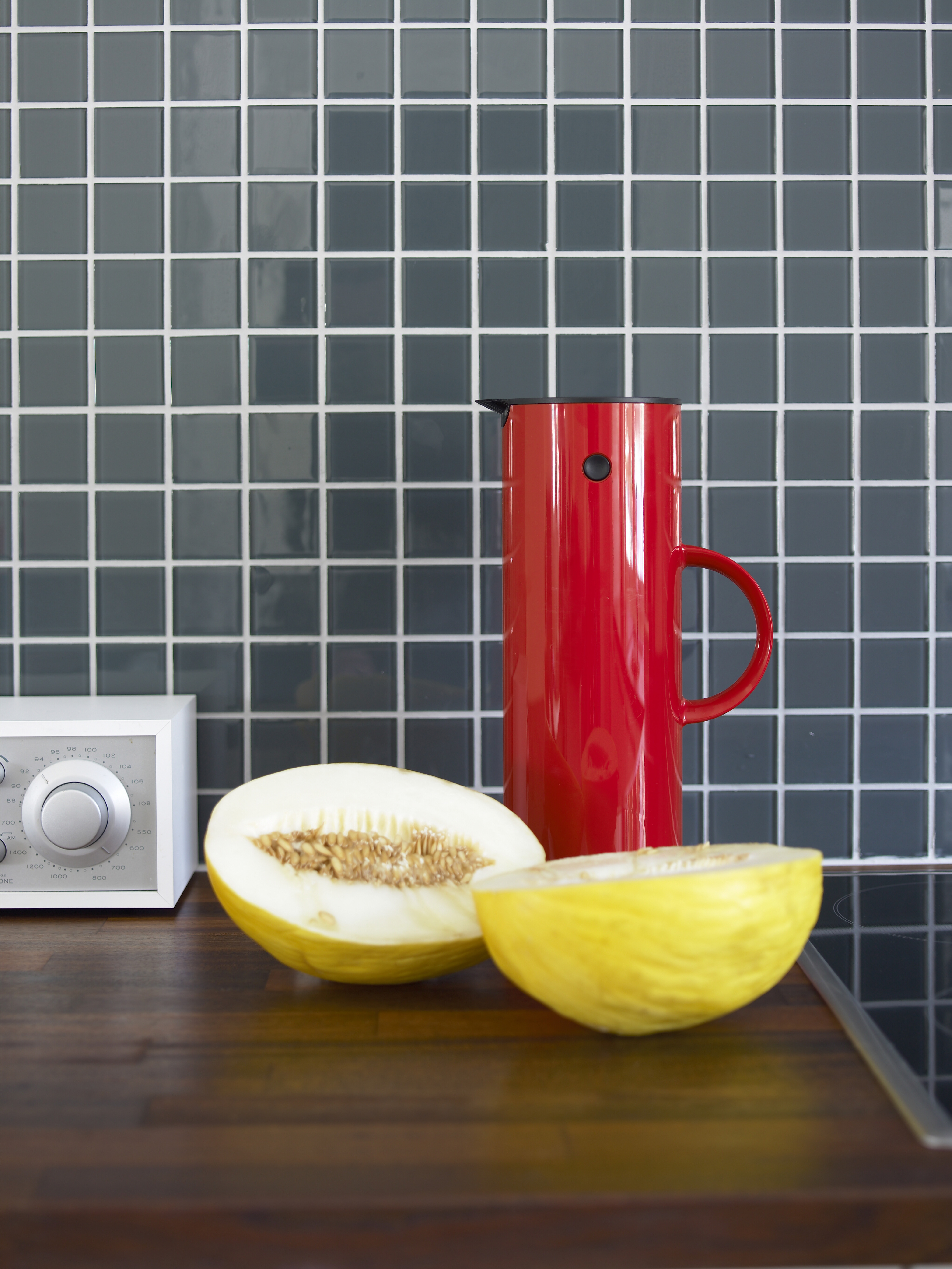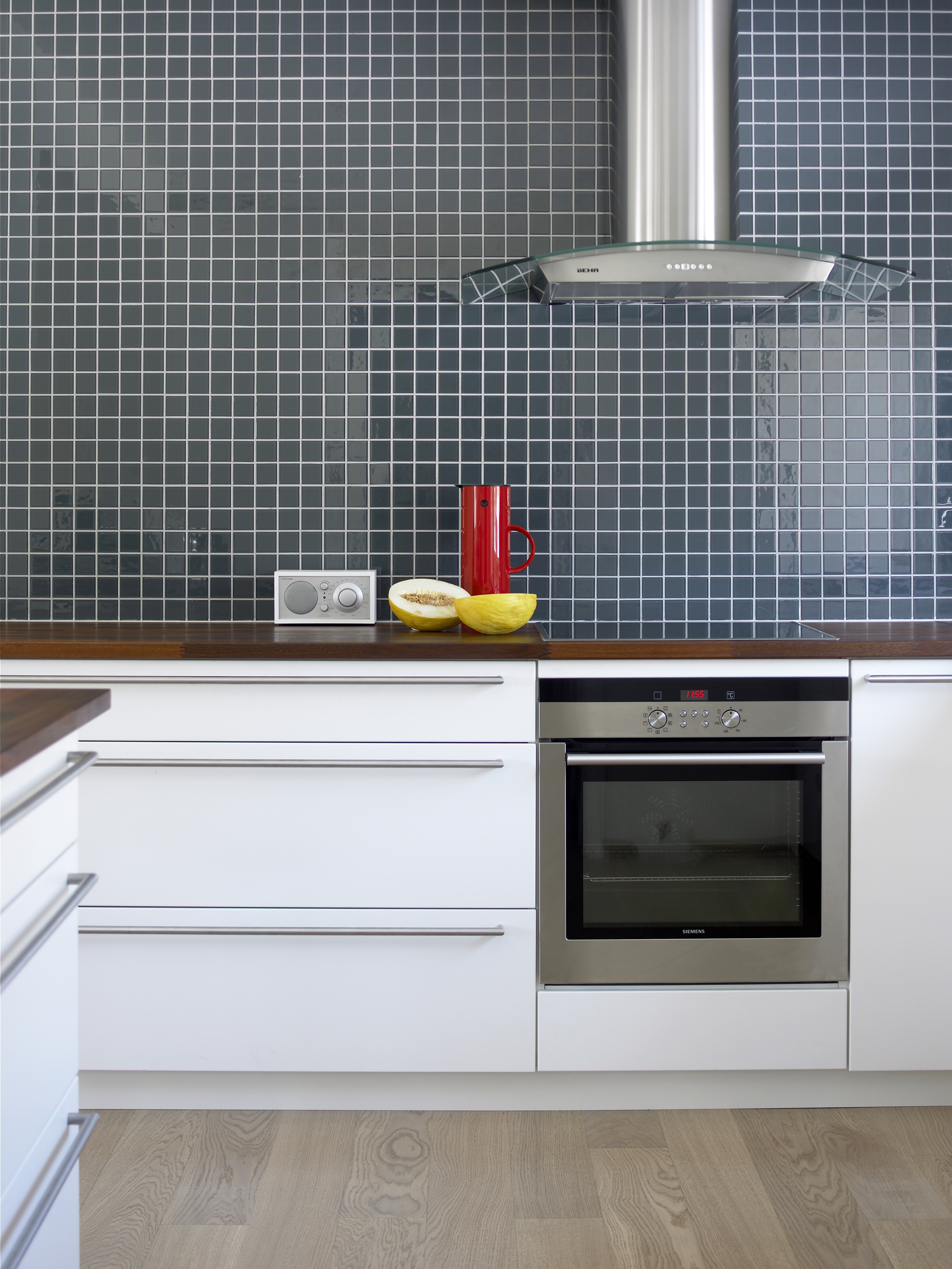 Befridd for alle skap kunne veggen bak kokeplassen fremheves med en overflate som gir litt visuelt overskudd til rommet. Den er kledd med mosaikkfliser i glass, transparent men med en fargetone i. Det gir en dybdevirkning som trer flott frem i ulike belysninger. Siden de lyse fugene er utsatt for fettsprut, er de behandlet med fugeforsegler.