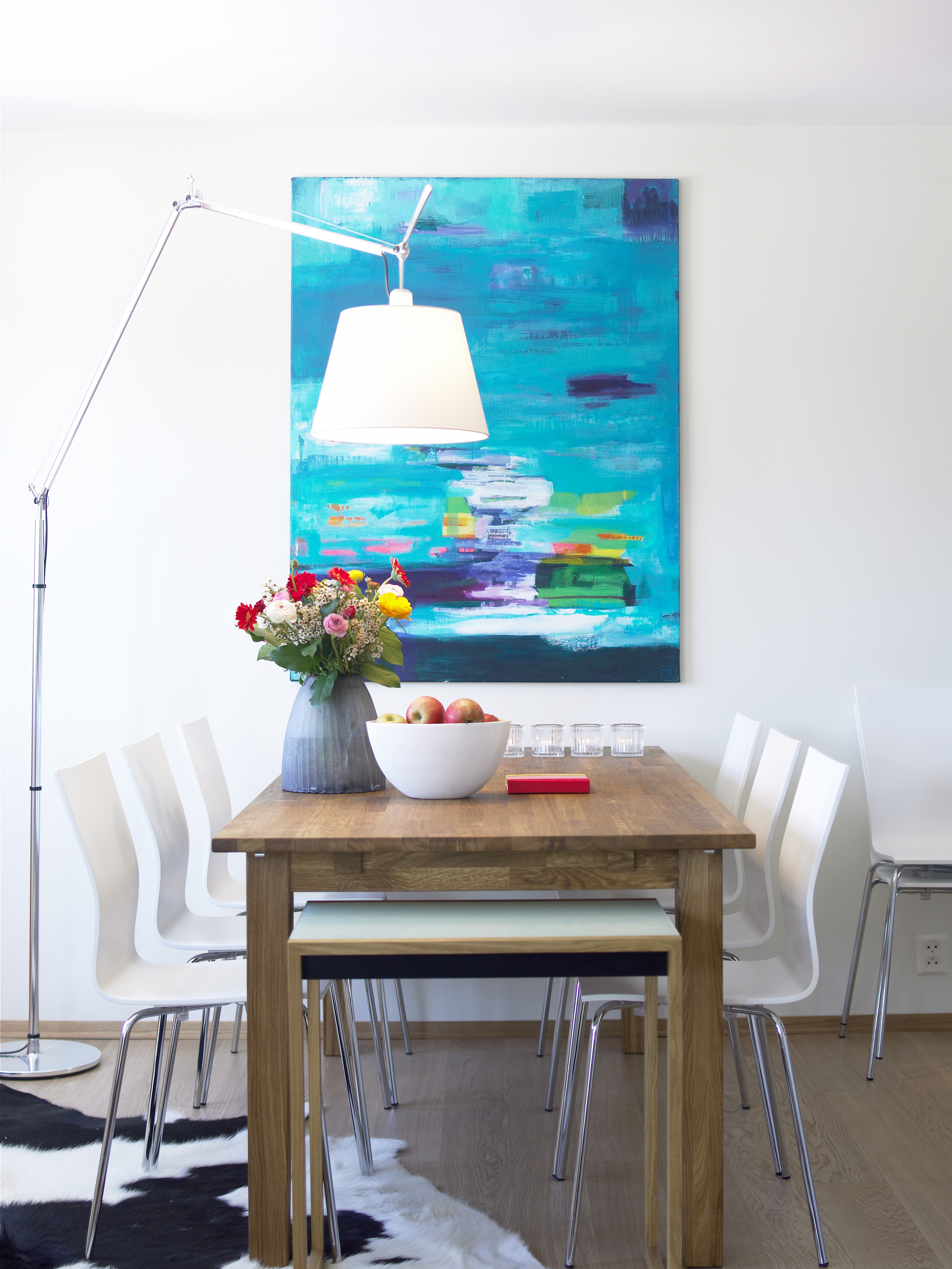- Å bruke ett gulvmateriale på alle flater er et svært viktig virkemiddel for å skape helhet og sammenheng fra rom til rom i et interiør, fremhever interiørarkitekten. Valget falt på et nøytralt kompromiss mellom hennes ønske om mørkt tre og hans om noe helt lyst. Hele første etasje har fått parkett i bred eikeplank som er behandlet med olje med hvitt pigment som ligger som et svakt, lett lysnende slør over treet.