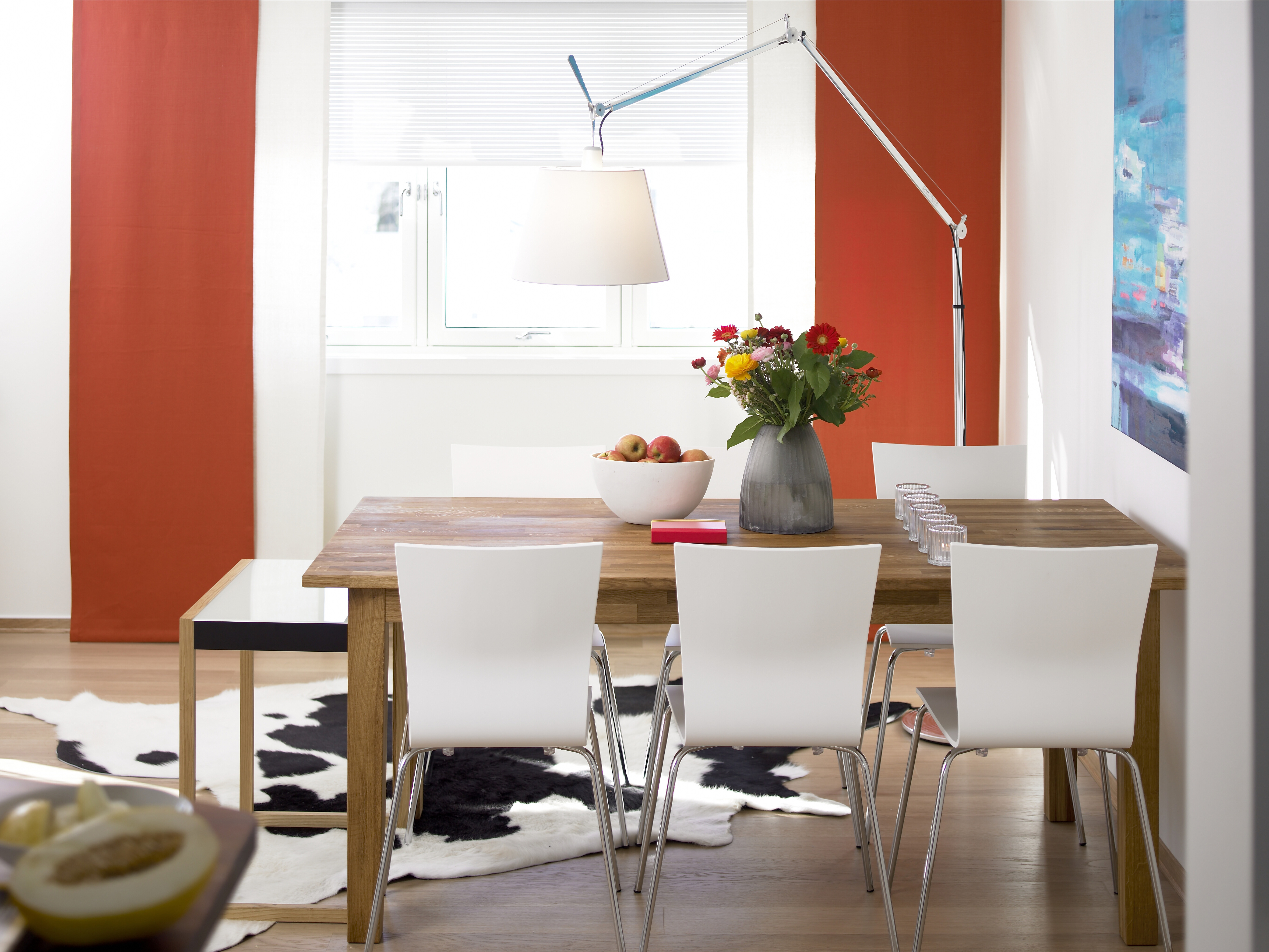 Rødt rom! Det ville Fredrik ha, så mye var sikkert! Her kom interiørarkitekten raskt til unnsetning: Et helt rødt rom er umulig å leve i! Det er en veldig påtrengende farge som virker helt overveldende i store doser. Men i små porsjoner er rødt en energisk gledesspreder.