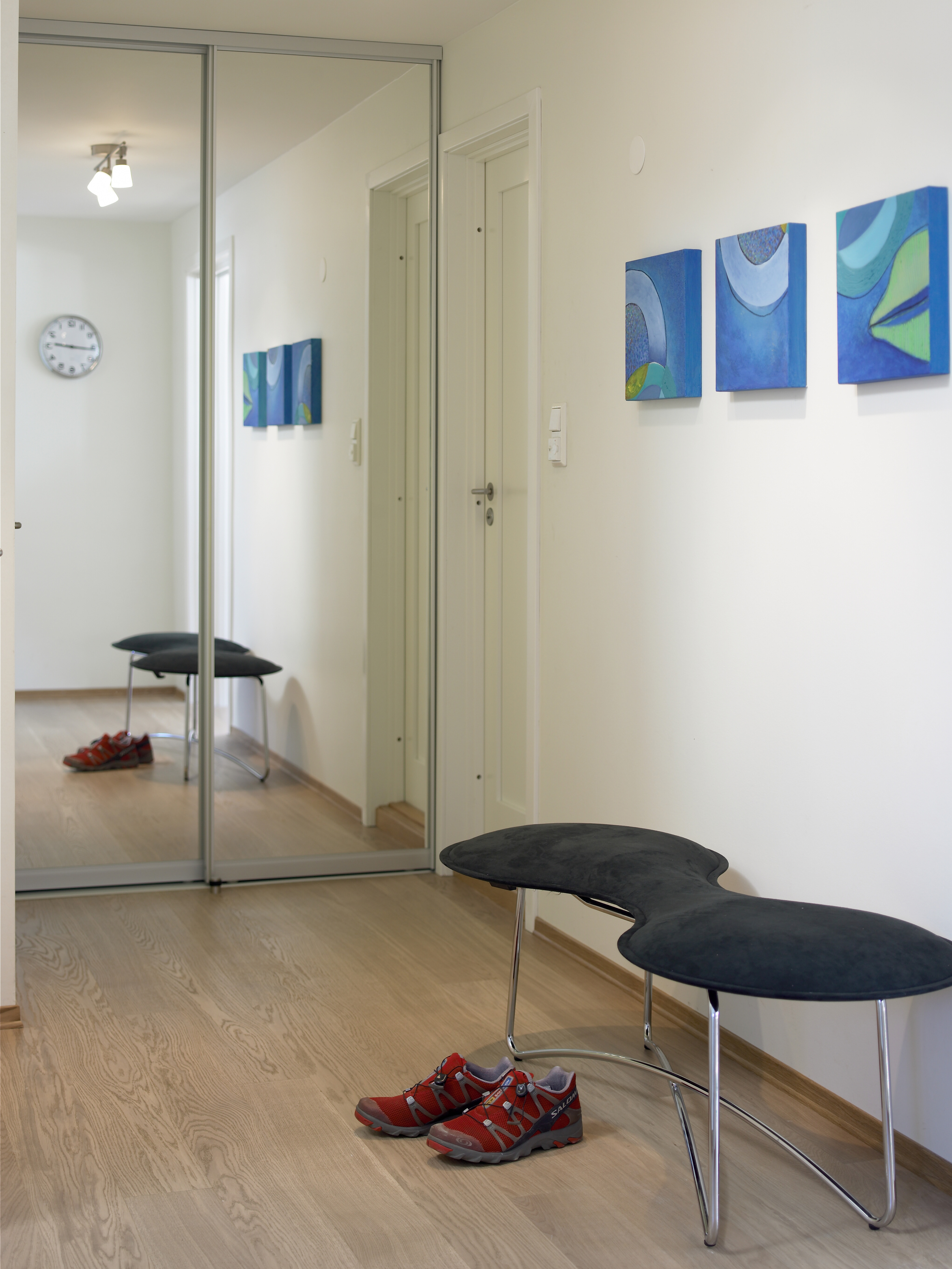 Interiørarkitektens løsning var å tenke i litt mykere linjer, litt mer smidig og mindre rettvinklet. Nå smyger gangen seg fra trappen i en brutt bue rundt det nye badet. Tre soverom har fått hver sin inngang på diagonalen. Badet er utvidet - stort er det ikke, men smart utnyttet. I tillegg er trapperommet åpnet med nytt sprinkelgelender oppe i stedet for et stort og stengende garderobeskap. Litt trang er nok trappen fortsatt, men det føles som om alt har vokst et par nummer.