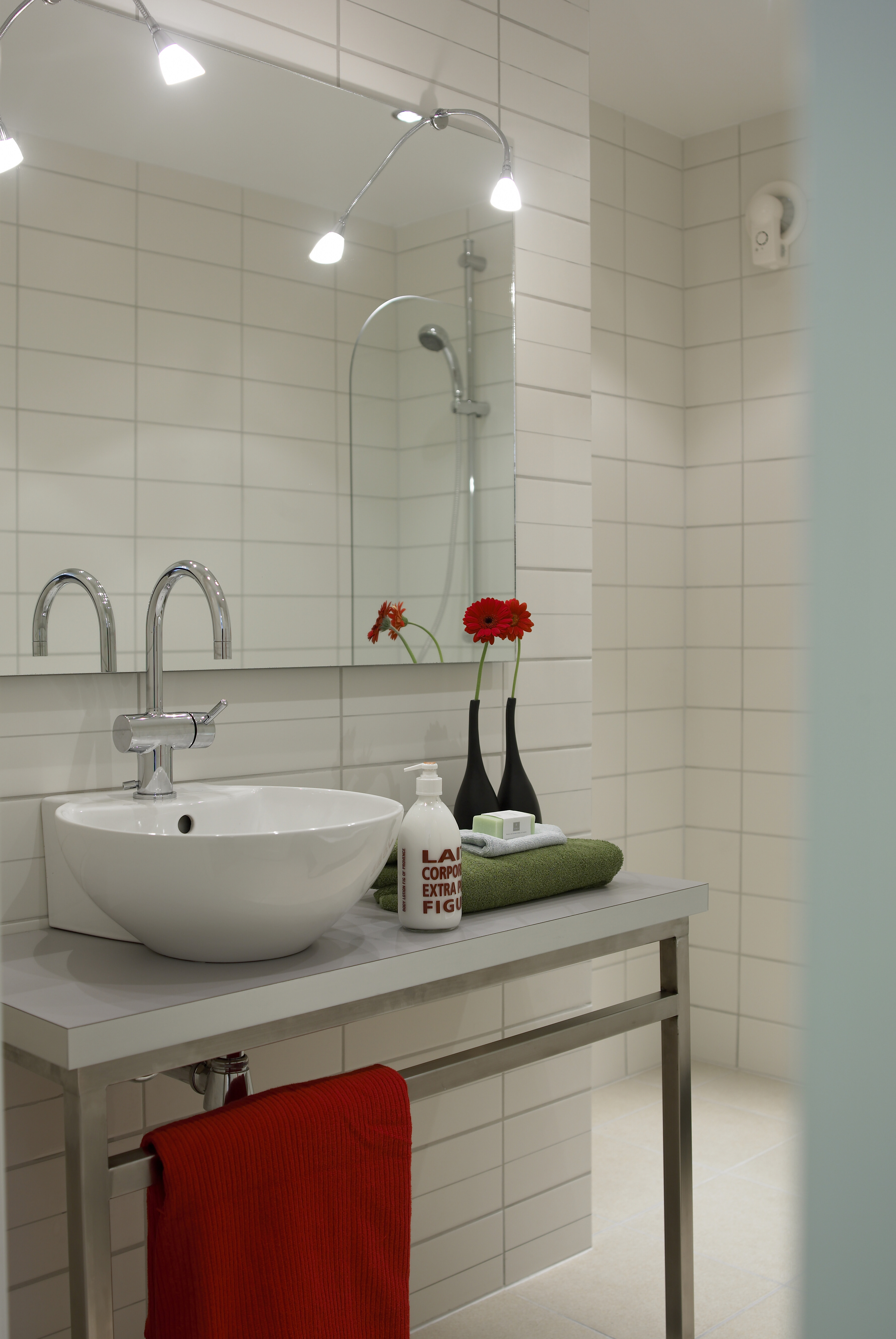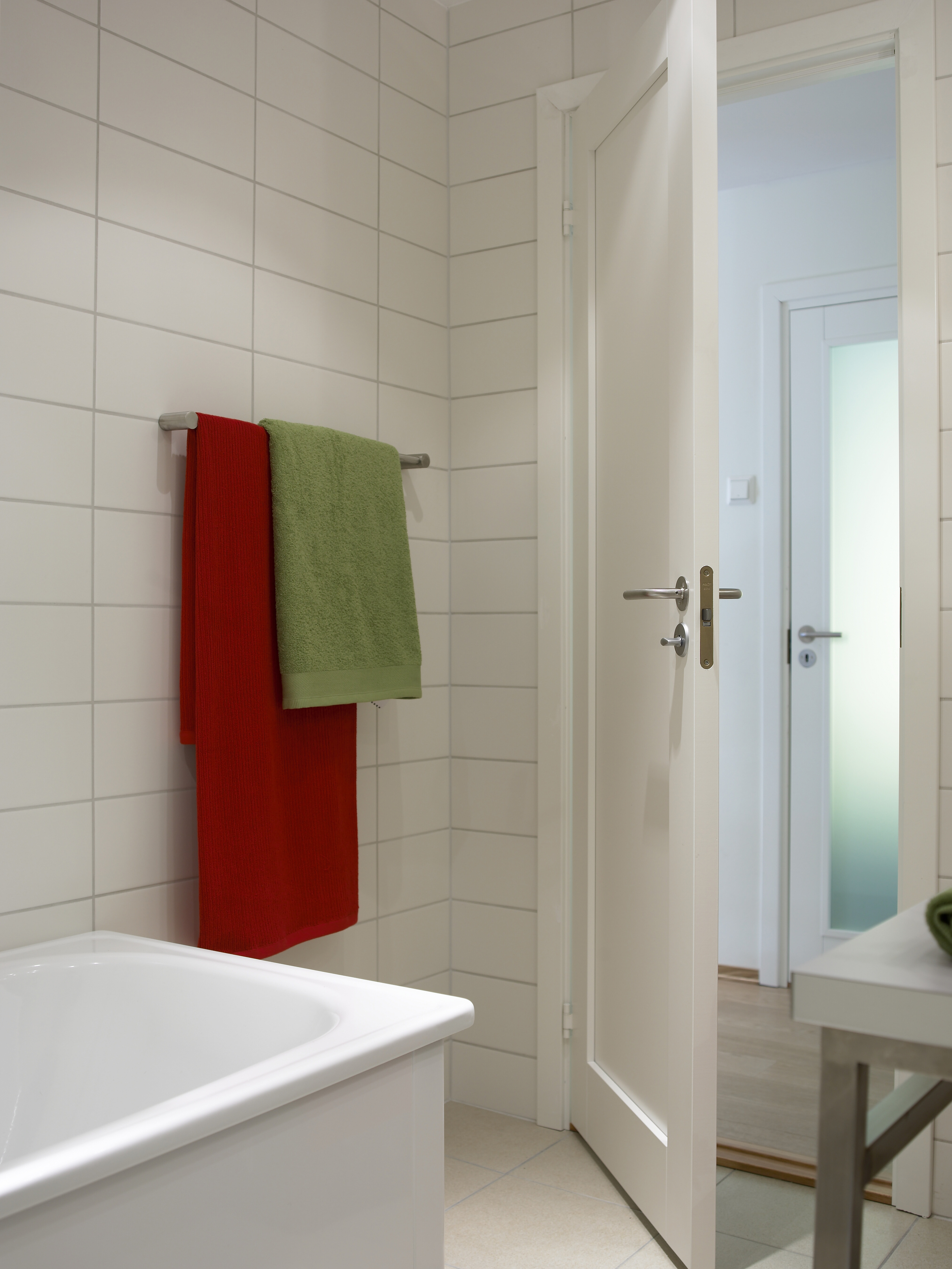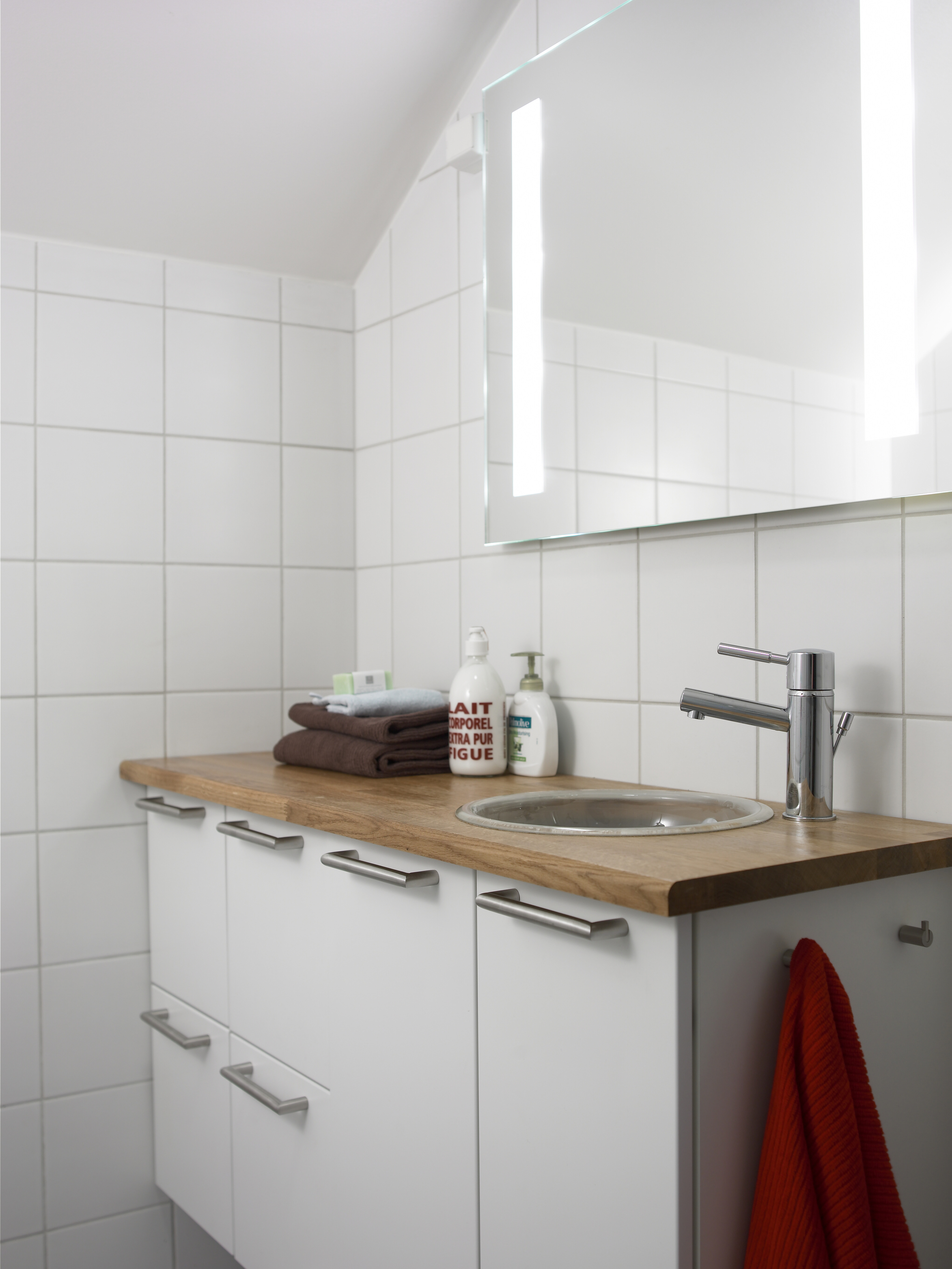 Det lille badet ligger praktisk til ved soverommene. Men når det er tid for en riktig velværestund, skjer det i det større badet nede. Det har nå fått en innbydende atmosfære preget av lyse, delikate farger - ikke rent hvitt, men mykere og lunere i tonen i samsvar med huset for øvrig. Funksjonene er flyttet om på, det fordyrer riktignok når rør må legges om, men dårlig planløsning er dårlig sparing. I nisjen der badekaret før var plassert, er det blitt god oppbevaringsplass. Nytt badekar er plassert ved langveggen, mens motstående vegg har fått vask og benk og bedre plass til egenpleie enn knøttebadet oppe.