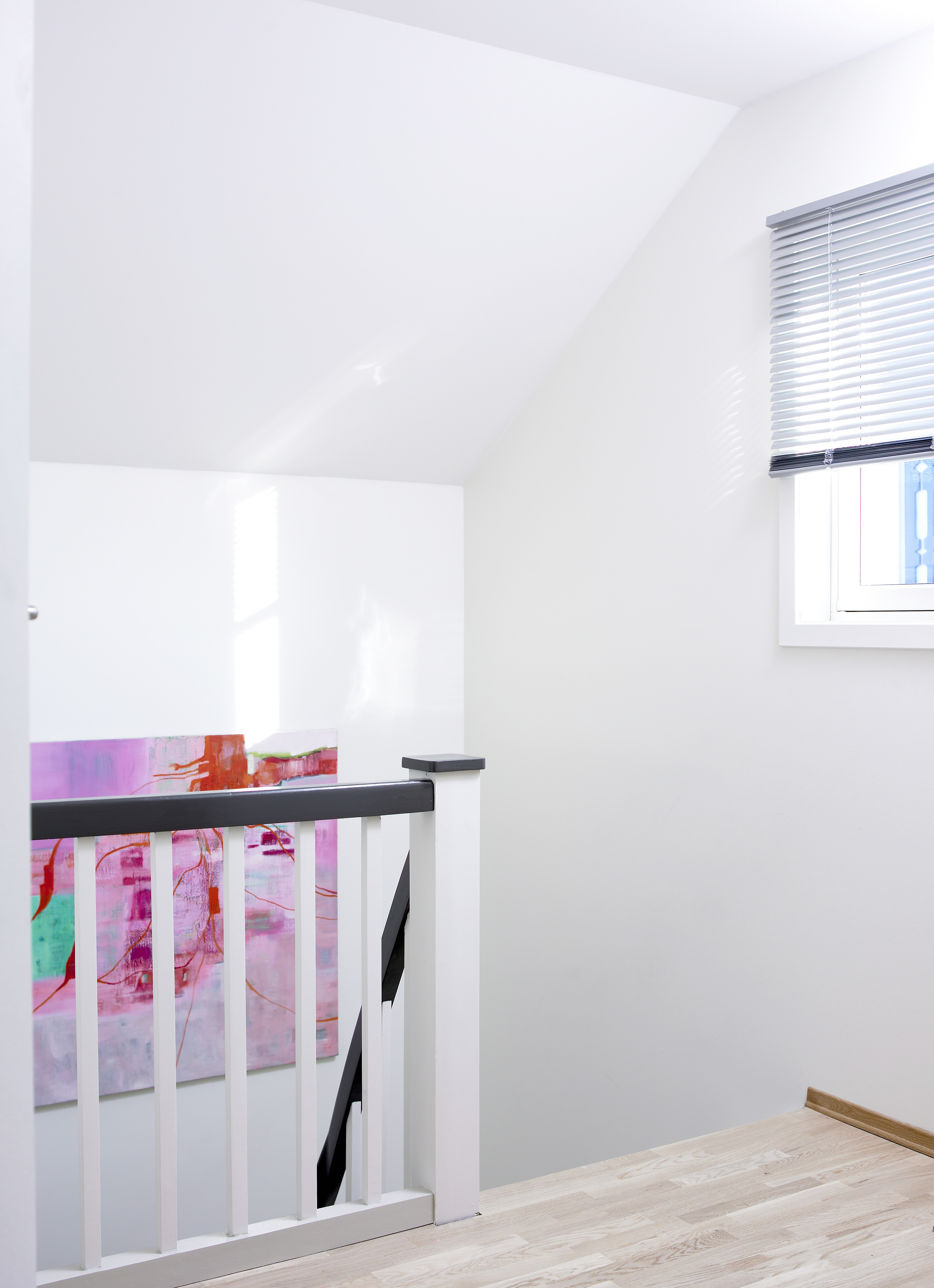 Også i andre etasje har alle rommene fått gulv i eik. Overflatebehandlingen er dem samme, men her er det brukt en smalere dimensjon som passer godt til rommenes beskjedne størrelser.