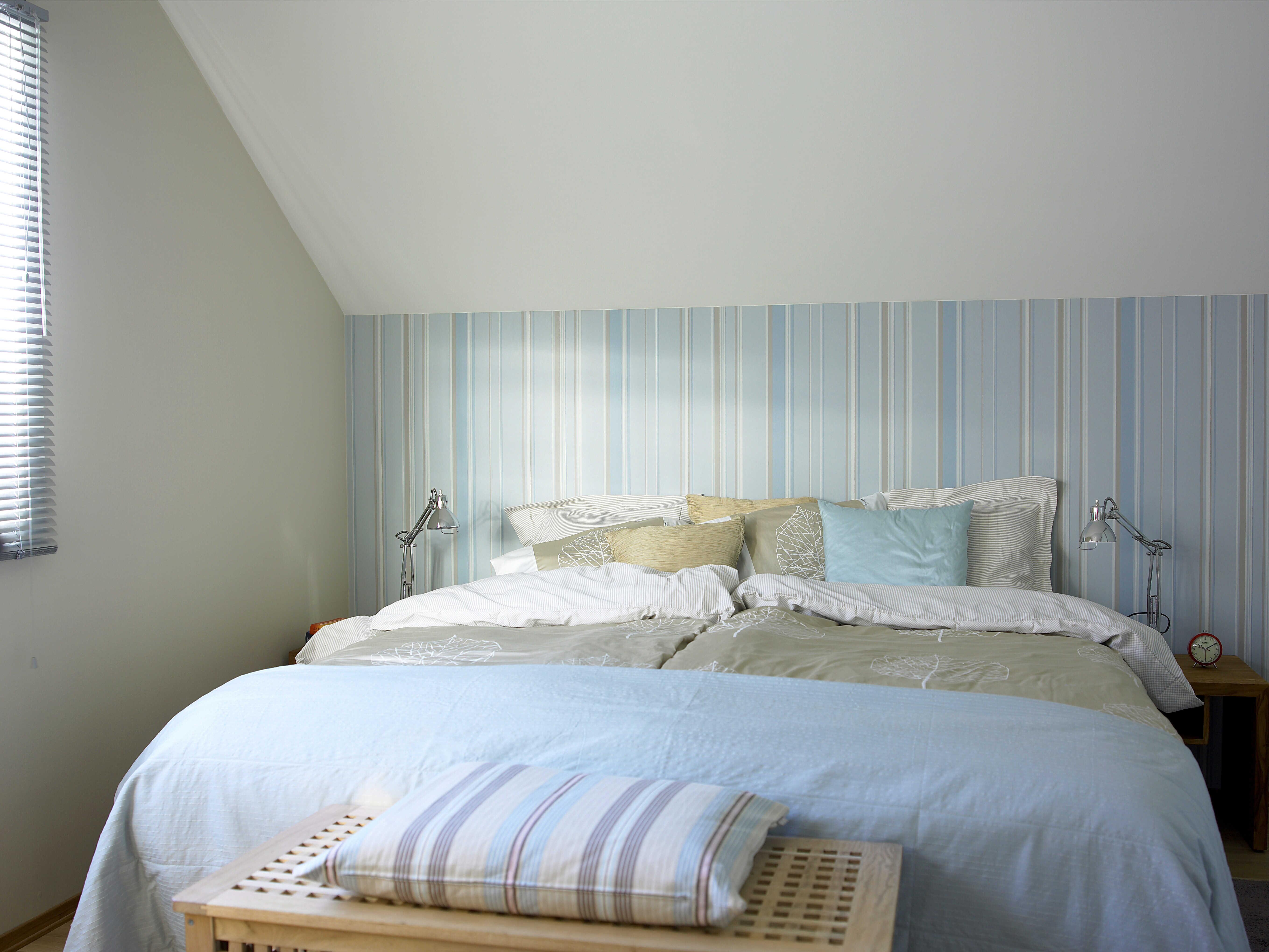 - Dette er også farger som er gode til et soverom. Det er viktig å ta hensyn til hvordan fargene påvirker oss, mener interiørarkitekten. Milde blåtoner føles friskt og beroligende, mens beige eller sandfarget gir behagelig varme til veggene. Vertikale striper er også med på å "strekke" rommet litt i høyden.