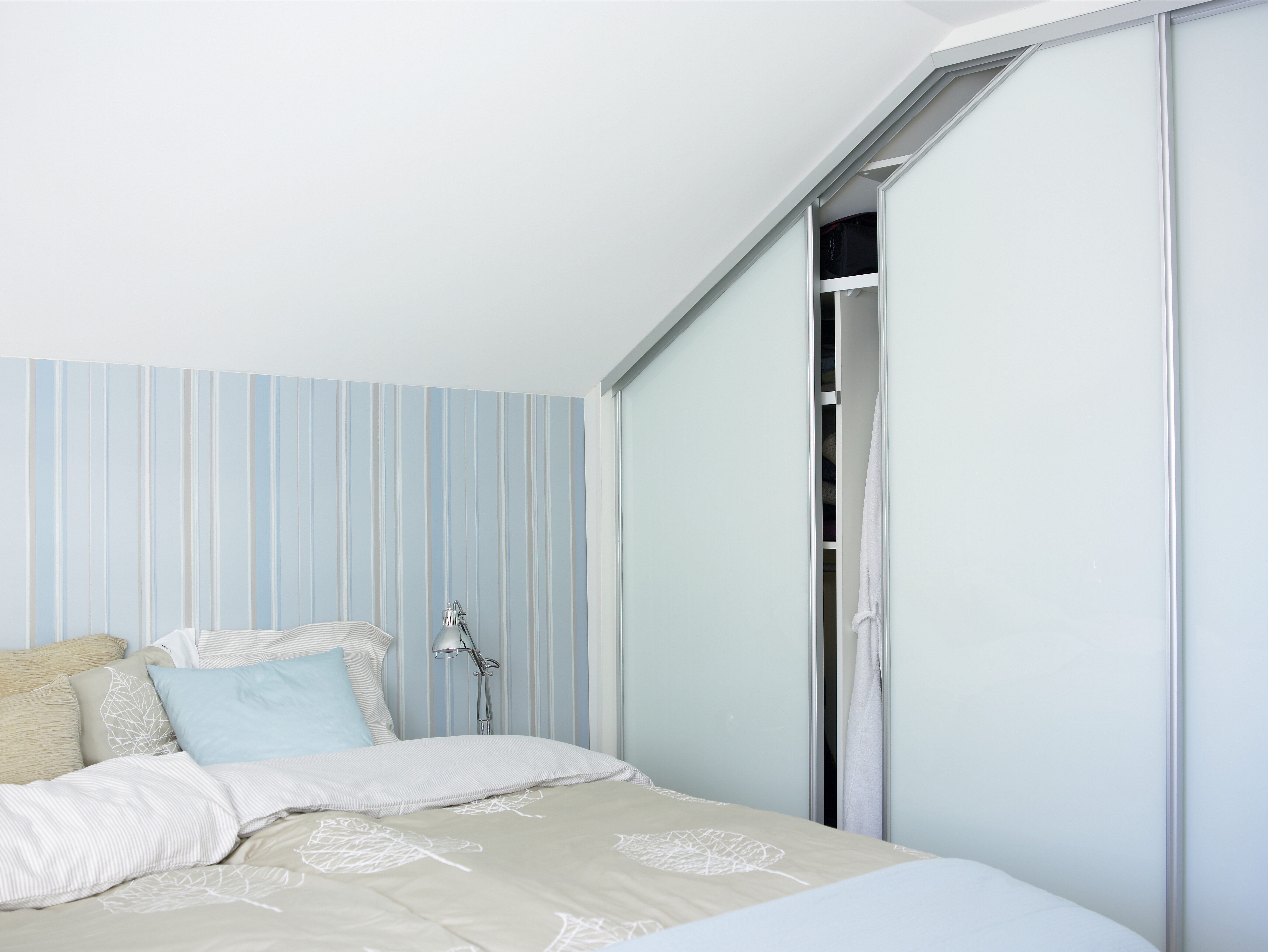 Dagens krav til garderobevolum har økt betraktelig på et halvt hundreår. Store, frittstående skap ruver mye i rommet. Spesialbygde løsninger som lages etter mål kan derimot smyges mer smidig på plass. Dessuten utnytter de hver centimeter som er til rådighet. Her er hele den ene veggen som fortsetter under skråtaket innredet med skyvedørsgarderobe. Fronter i frostet glass gjør at den virker lett og opptar minst mulig av romfølelsen.