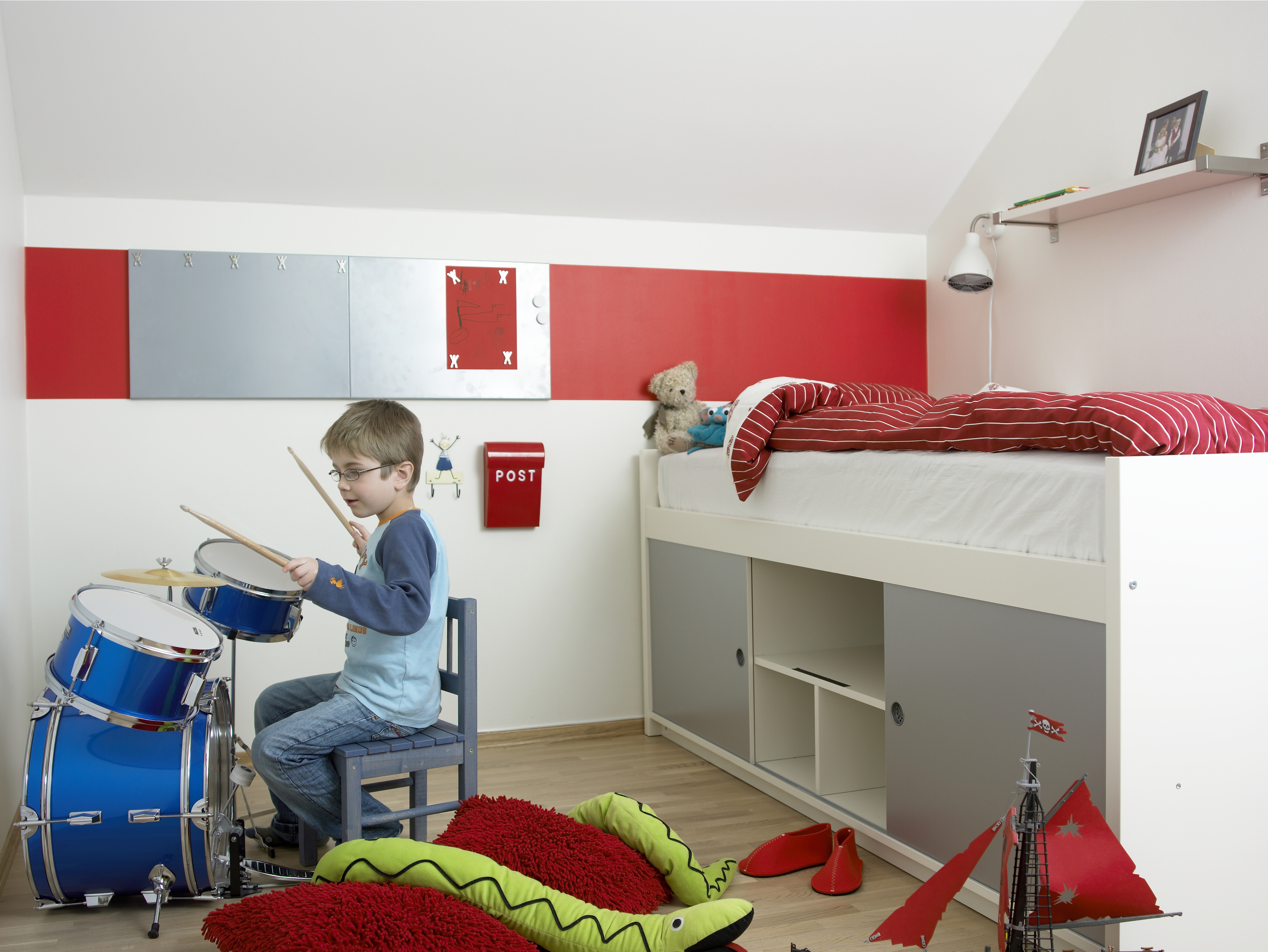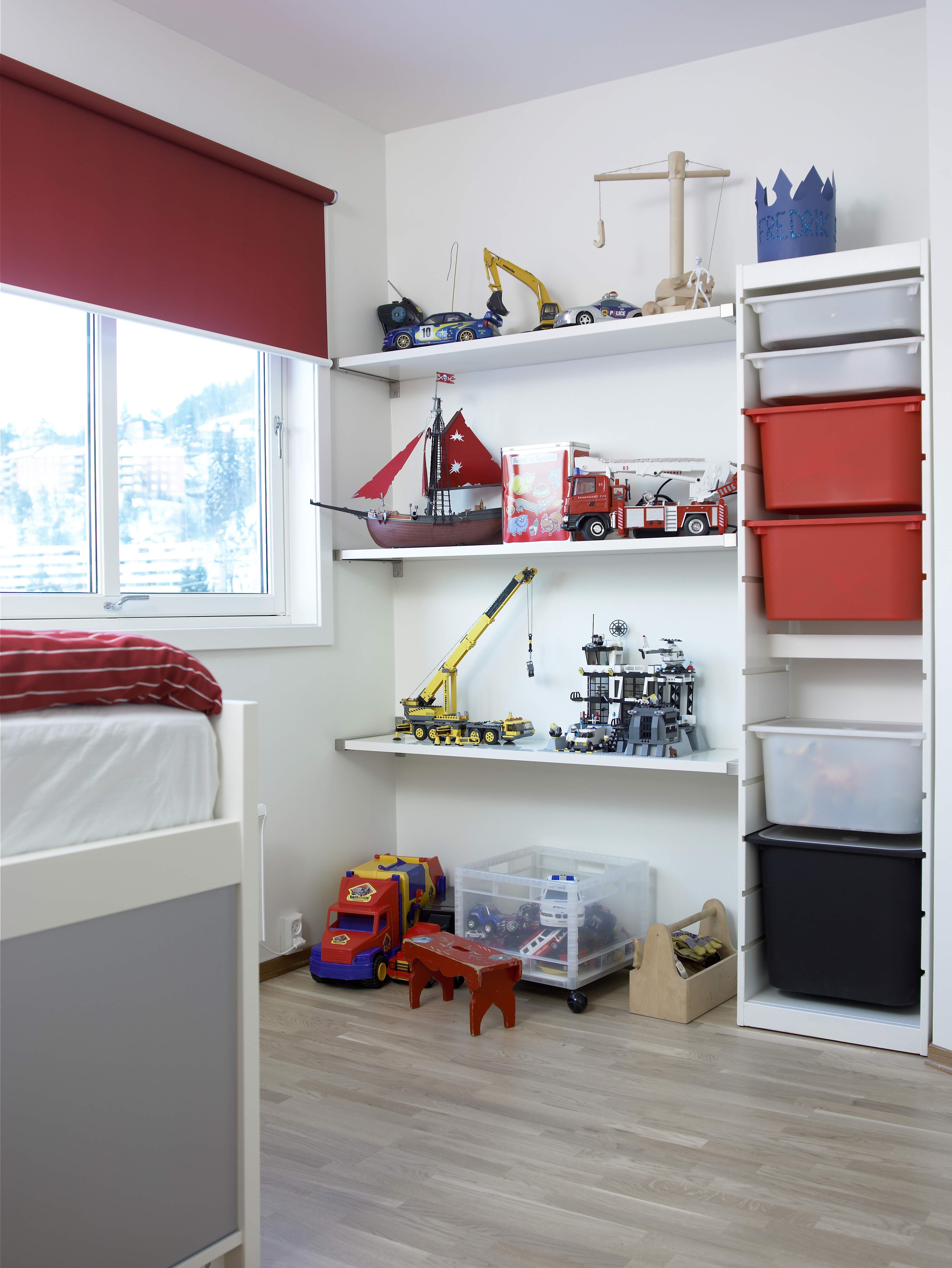 Nå når rommet står ferdig er det ingen som etterlyser mer av den elskede rødfargen. For rommet er jo rødt i uttrykket. Friskt og freidig lyser det mot de enkle, hvite veggflatene. Og flott effekt ble det: Med rødt i sengetøyet, rødt i gardinene, rødmalt veggfelt og røde magnettavler. Bare en ting står fortsatt på ønskelisten: En stor rød F for Fredrik!