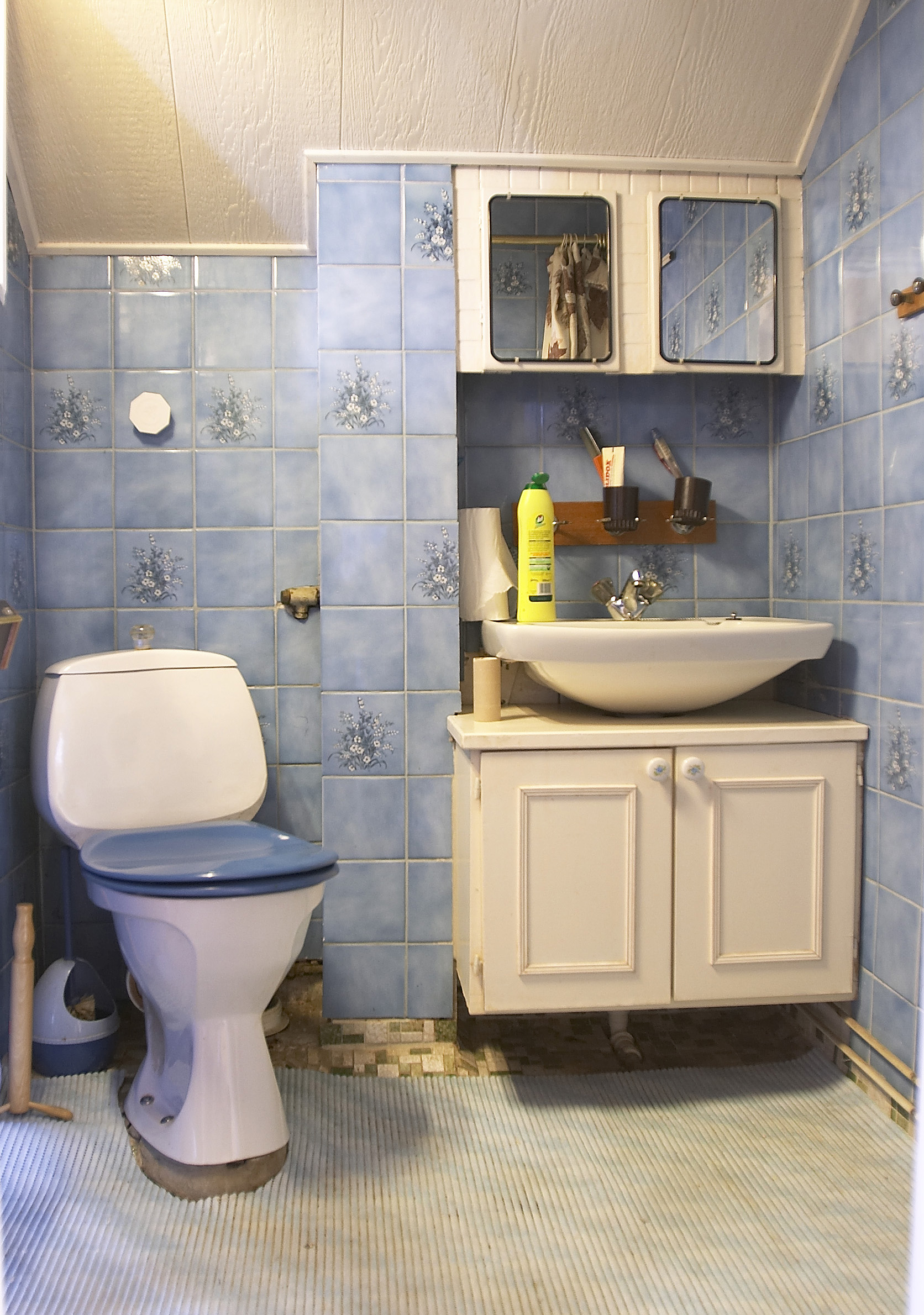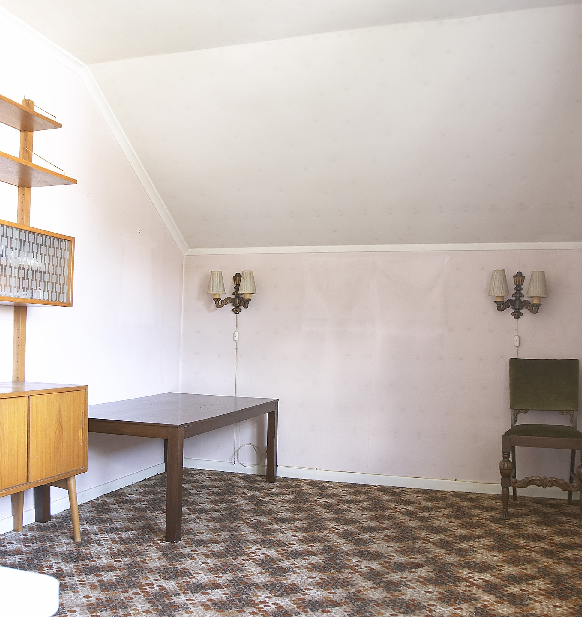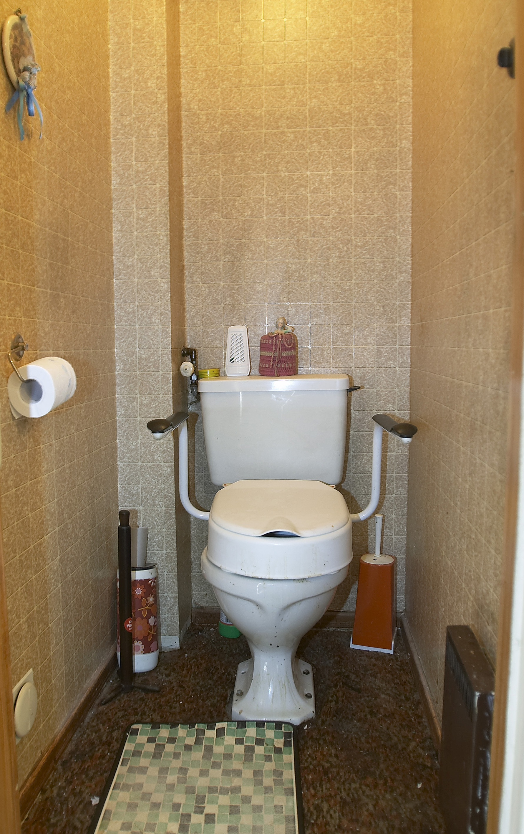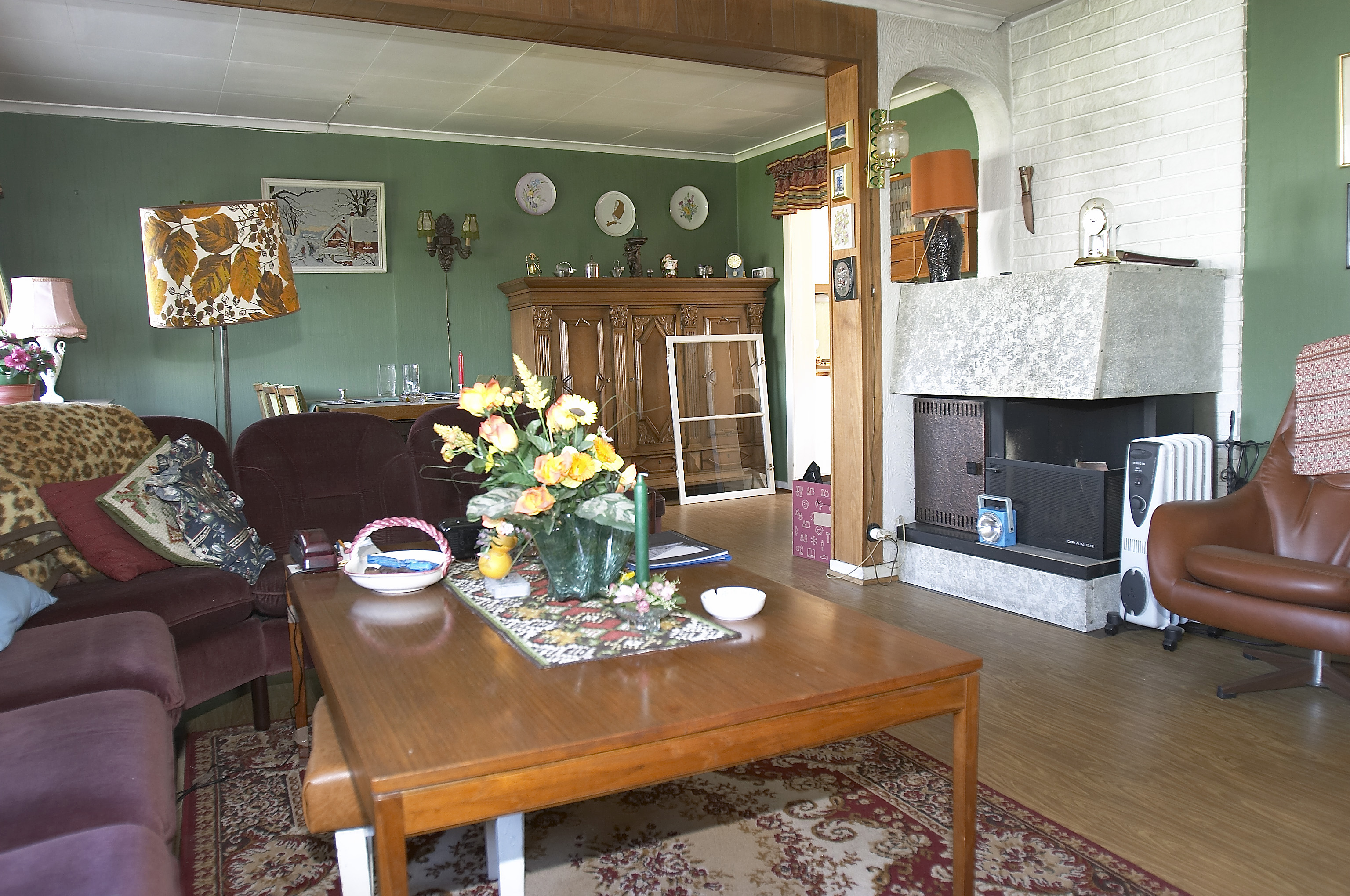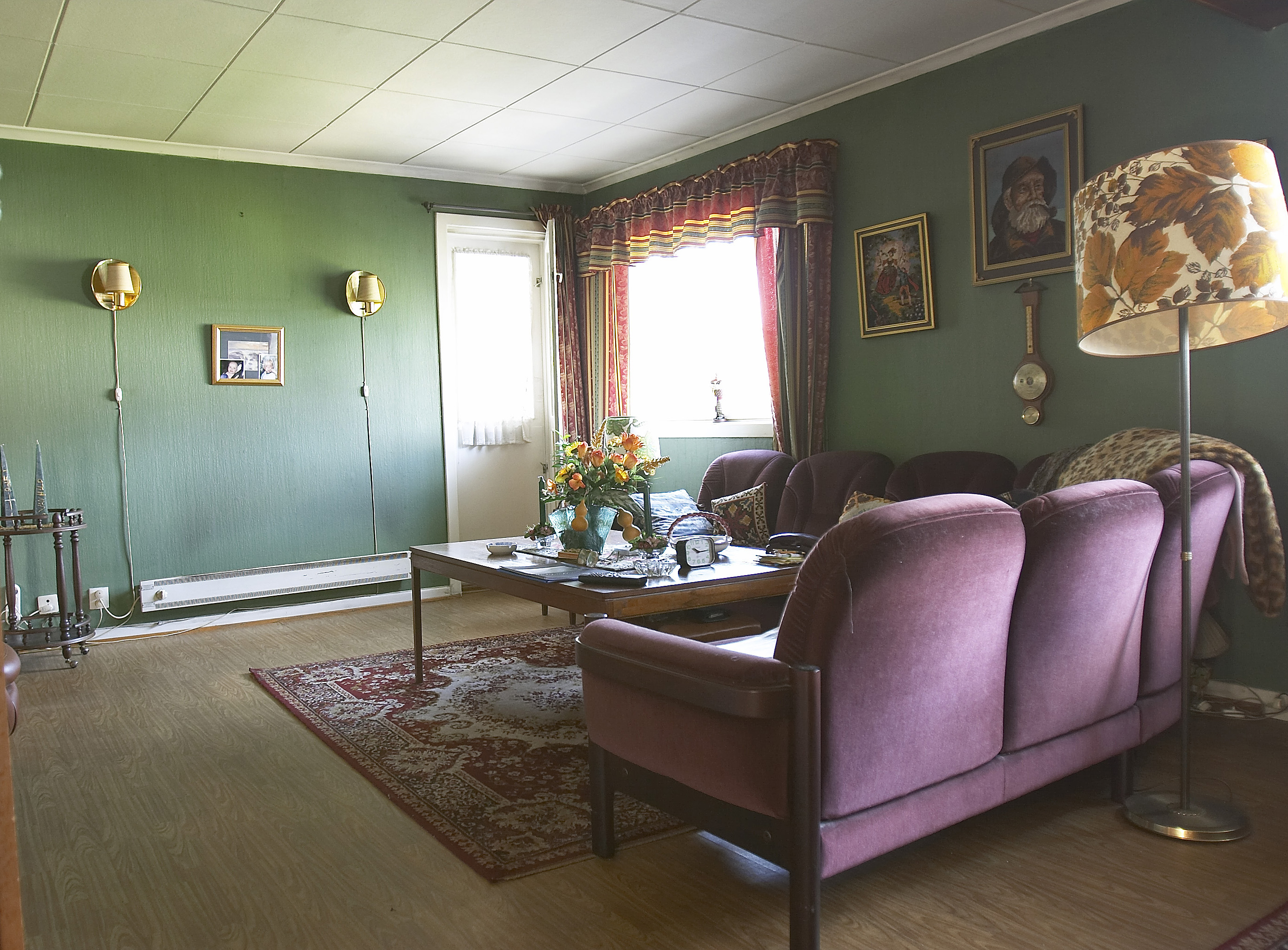 Det var et veritabelt lappeteppe av alle slags belegg fra mange tiår tilbake som dekket samtlige gulv i huset: Brune sjatteringer i entréen og kjøkkenet, "jukseparkett" i stuen, spraglefliser på badet, snusbrunt på toalettet, relieffteppe og mønsterteppe i soverommene.