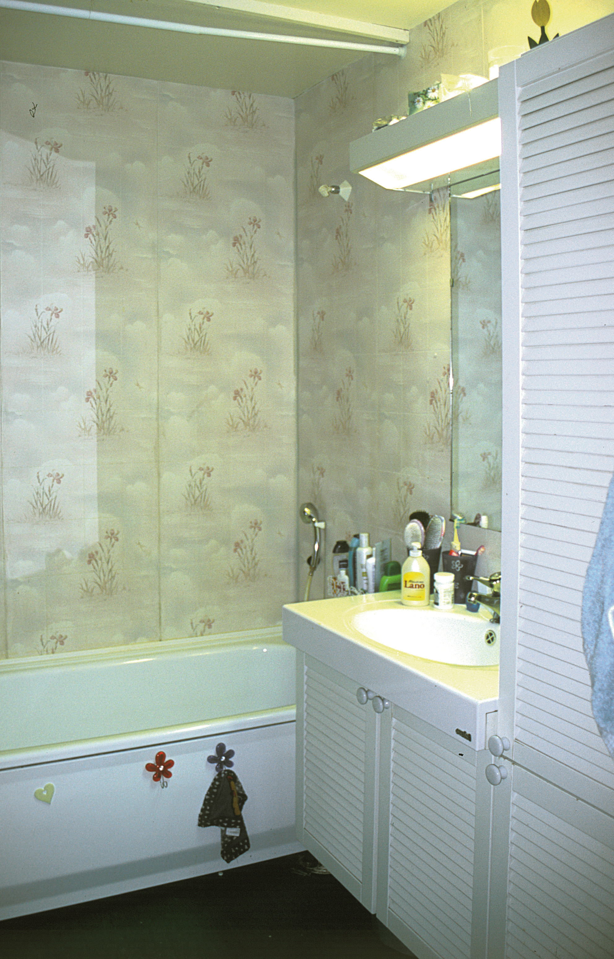 Ved tapetsering må underlaget være helt jevnt. På to av veggene ble den gamle veggvinylen beholdt, løs vinyl ble revet vekk og veggen ble sparklet jevn. Først flekksparklet, så helsparklet, med pussing mellom lagene. På to av veggene ble det satt opp gipsvegger for å bygge inn rør, så her ble gipsplateskjøtene og skruehullene sparklet før grunning og tapetsering.