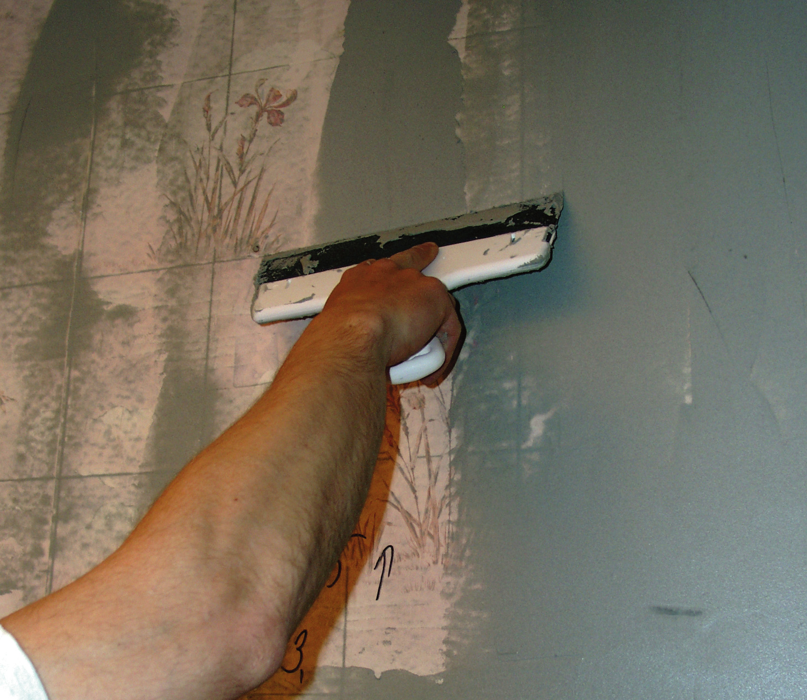 Veggen ble grunnet fordi tapetet var så lyst og gjennomskinnelig at fargeforskjeller på veggen bak ville synes igjennom. Her brukes en vanlig vannbasert heftgrunning som tørker til neste dag. Det anbefales å grunne hvis veggen har ulike underlag som suger ujevnt.