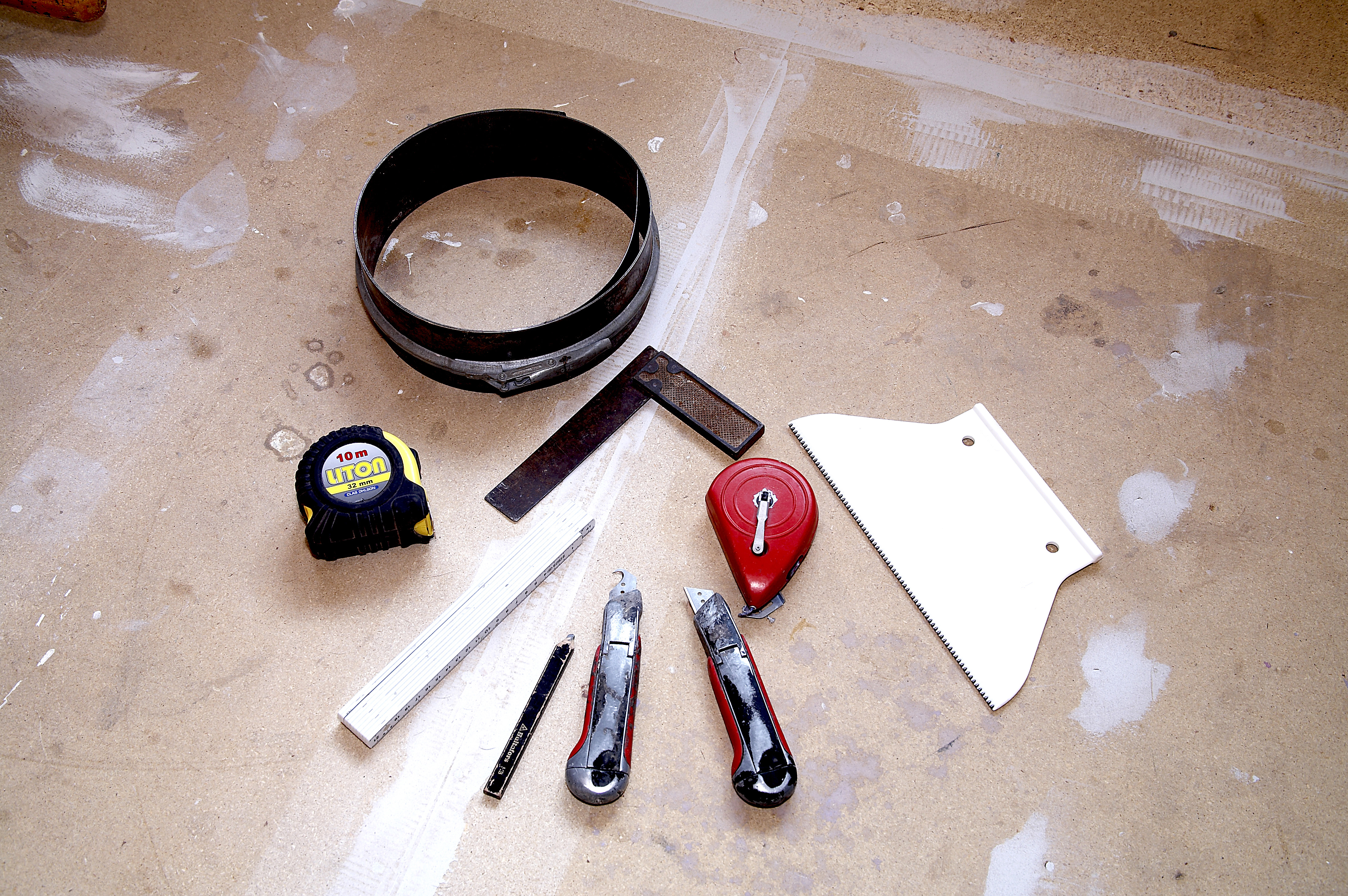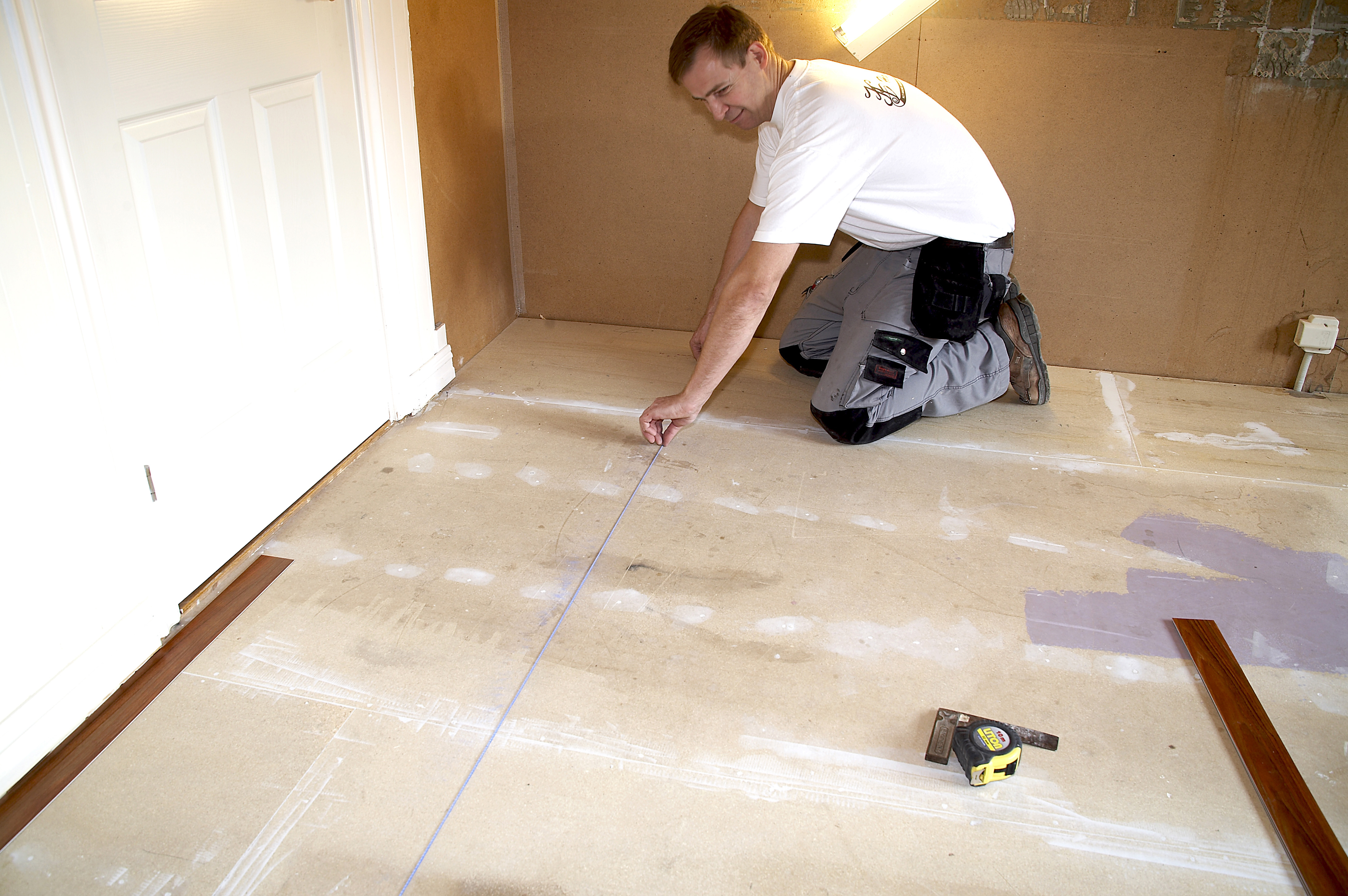 Når første del av gulvet er ferdig, går du over på den ferdige delen, og begynner å arbeide deg utover fra det ferdiglagte gulvet. Vær forsiktig når du går på den nylagte vinylen, det er fort gjort å forskyve flisene, så her gjelder det å trå varsomt. Mål opp et tilsvarende område som sist, marker med krittsnor igjen, og påfør lim. Fortsett slik til du når den andre veggen.