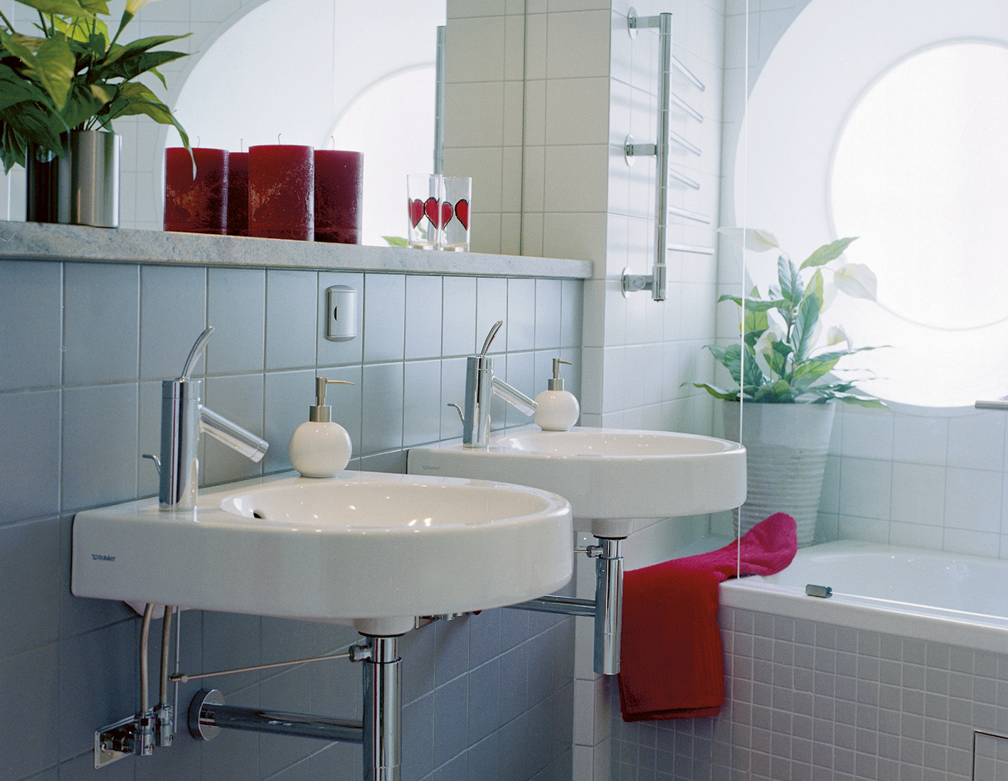 Badene blir flislagt. Her er både Marazzi og Höganäs med på leverandørsiden. Blandebatteriene fra Axor er designet av Phillipe Starck. Benkeplater både på kjøkken og bad er i granitt. Fargeutvalget består av en sort variant fra Sør-Afrika, en beige fra Brasil og en grå fra Finland. Også dørene er i eik, men i motsetning til gulvenes naturfarge blir disse tonet med hvit lasur. Både dørene og de hvitlaserte garderobeskapene er takhøye.
